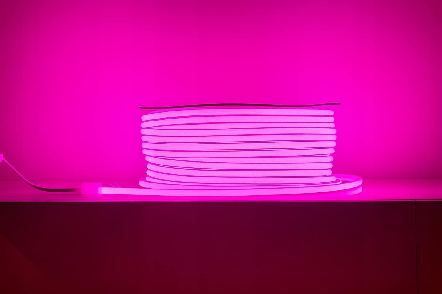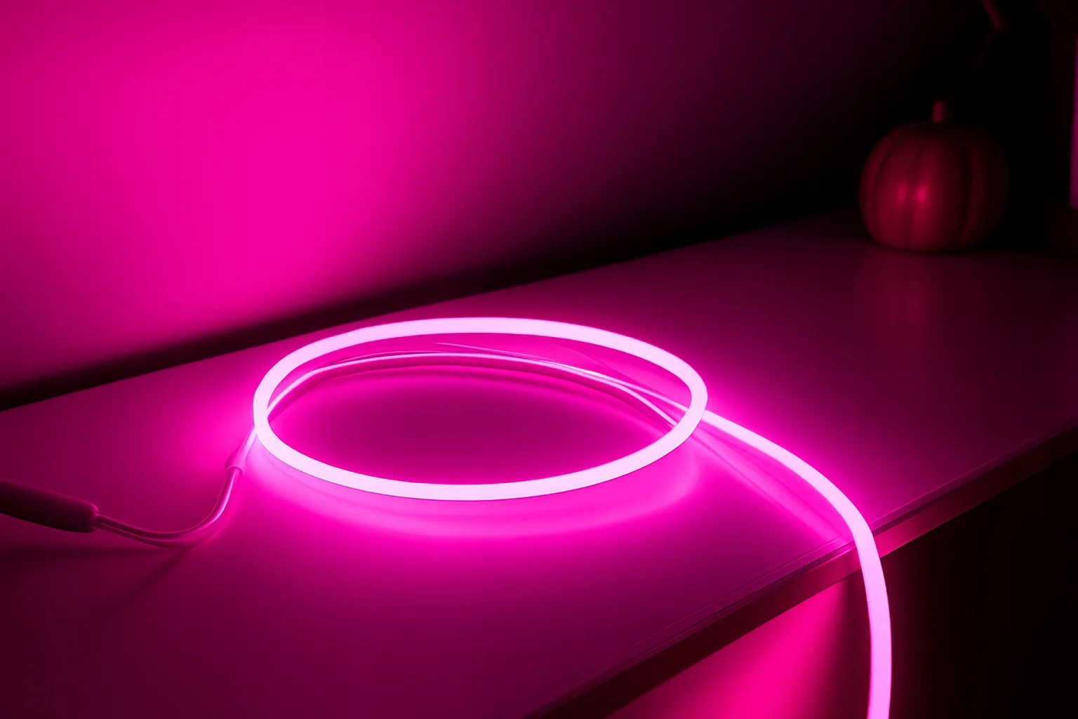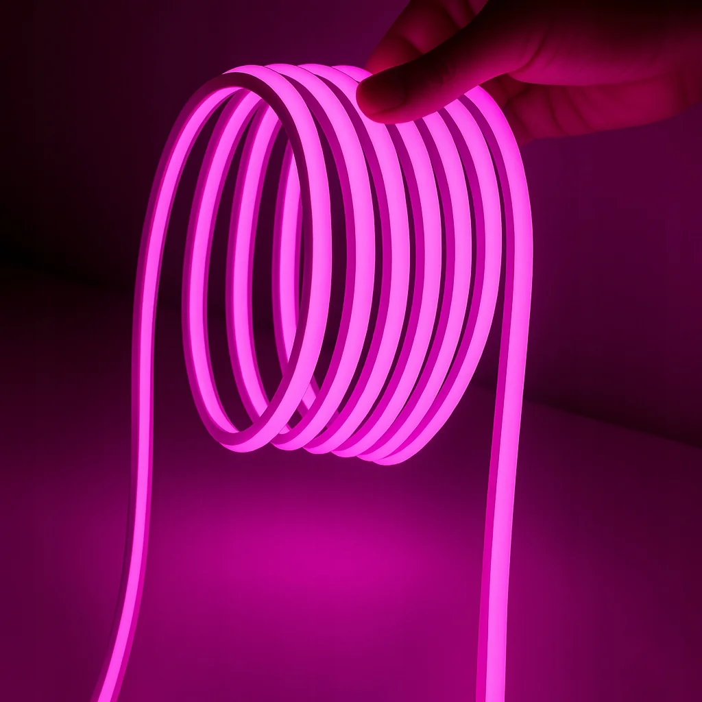 Różowa barwa przyciąga wzrok i podkreśla kształty instalacji. Ponadto zasilanie bezpośrednio z 230V upraszcza montaż, ponieważ nie wymaga klasycznego zasilacza LED. Jednocześnie neon pozostaje elastyczny, więc łatwo dopasujesz go do projektu.