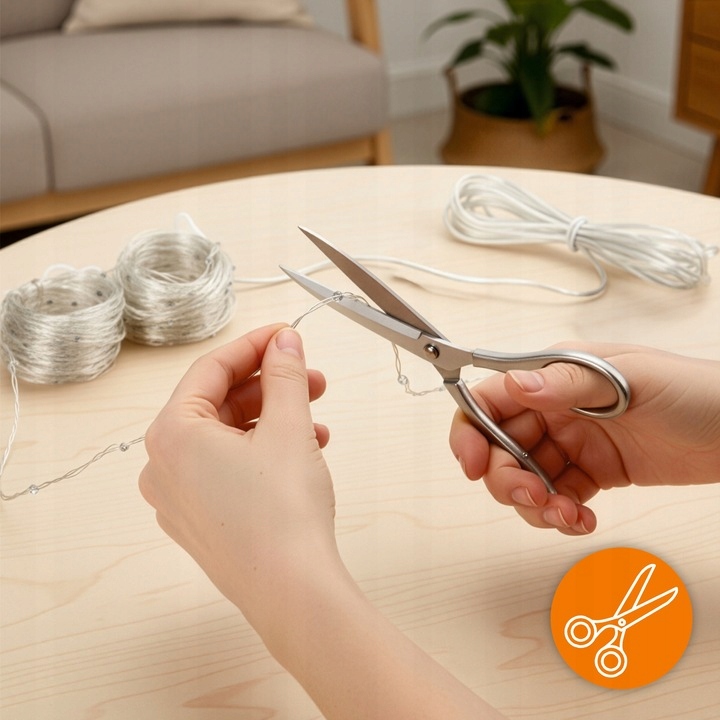 W komplecie otrzymujesz 5 haczyków montażowych, więc zawieszenie kurtyny jest proste i stabilne. Ponadto drucik można przycinać między diodami, jednak wyłącznie po wcześniejszym odłączeniu od zasilania. To daje większą swobodę dopasowania.