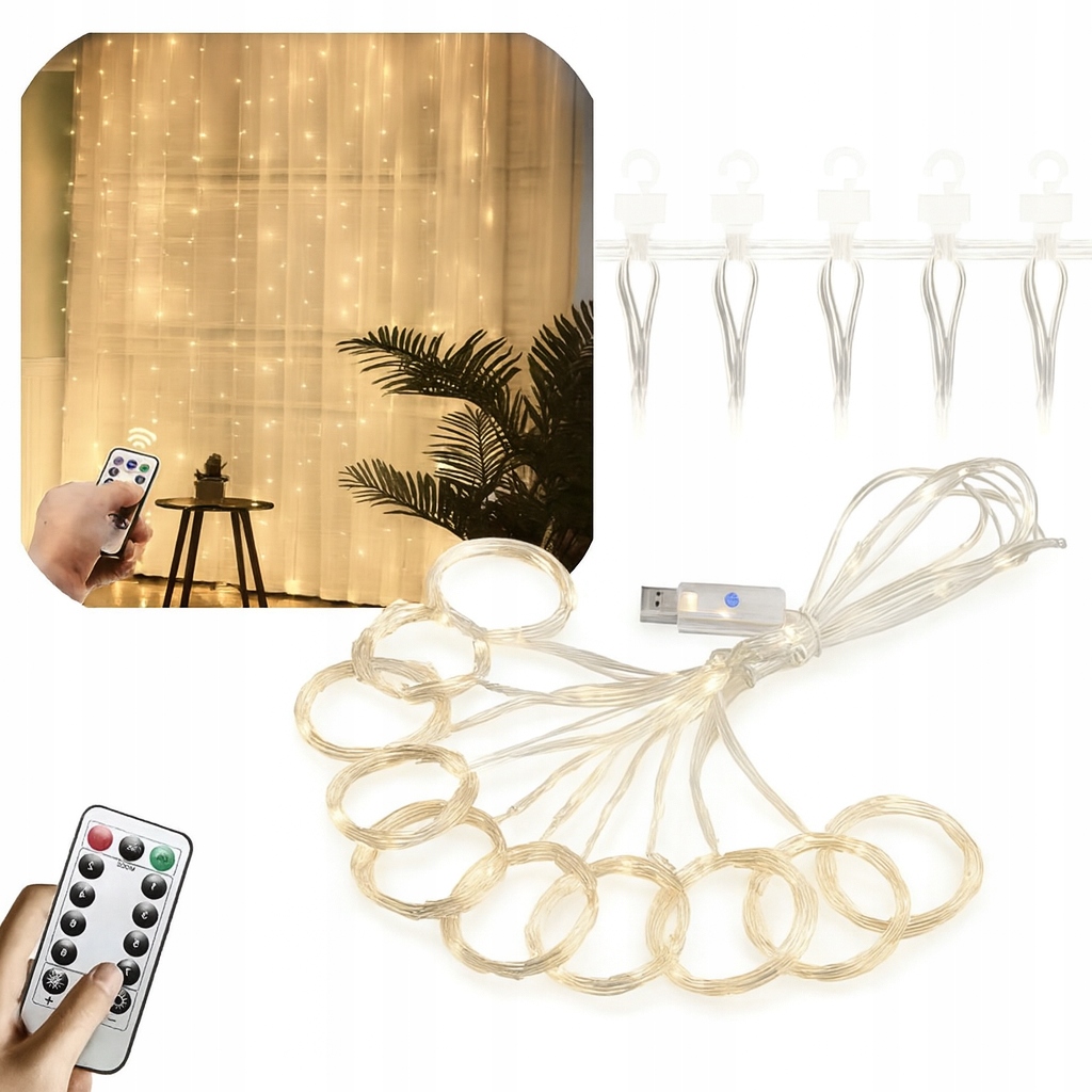 Kurtyna LED 2×2 m 200 LED Ciepła USB Pilot Drucik