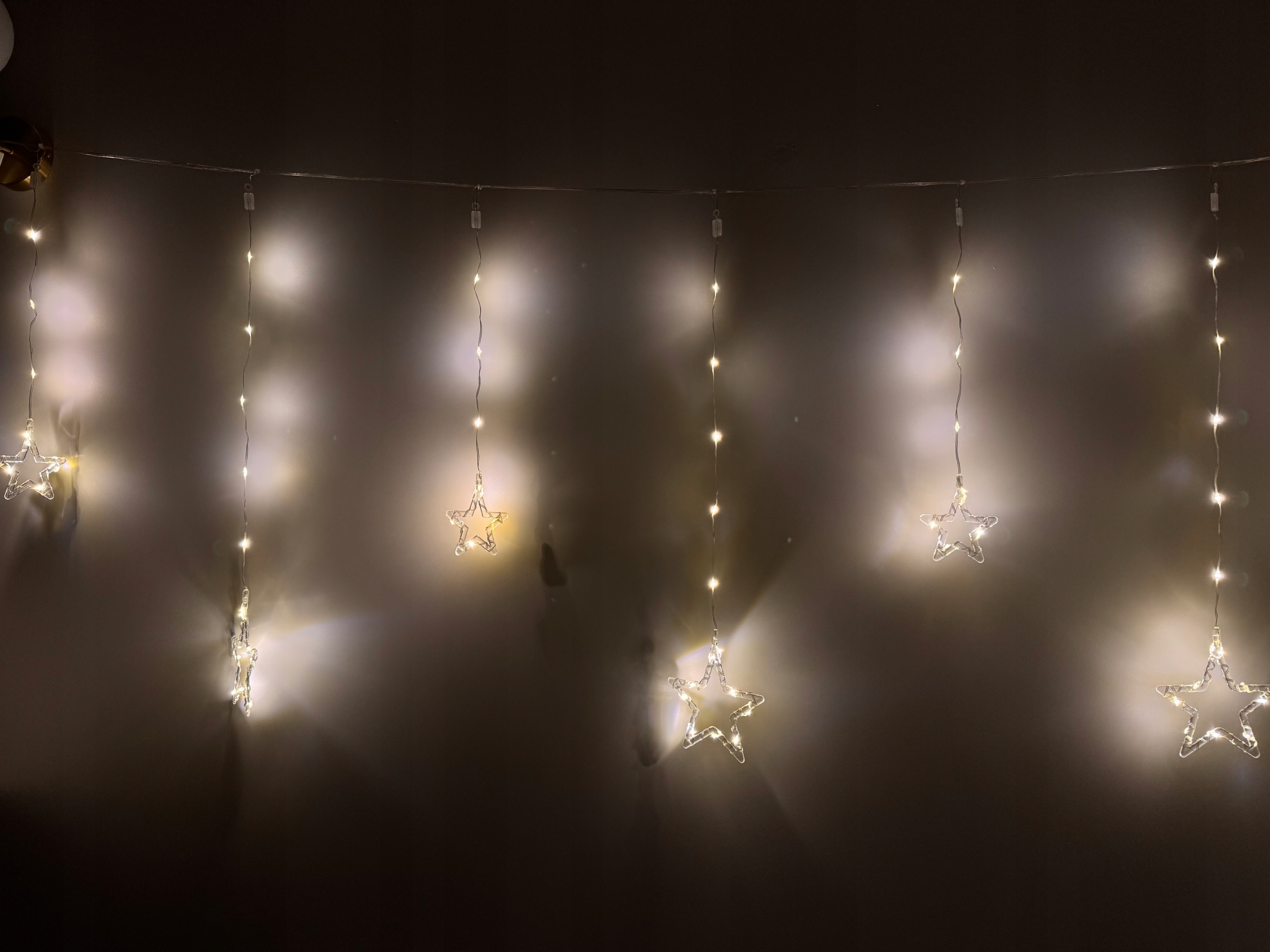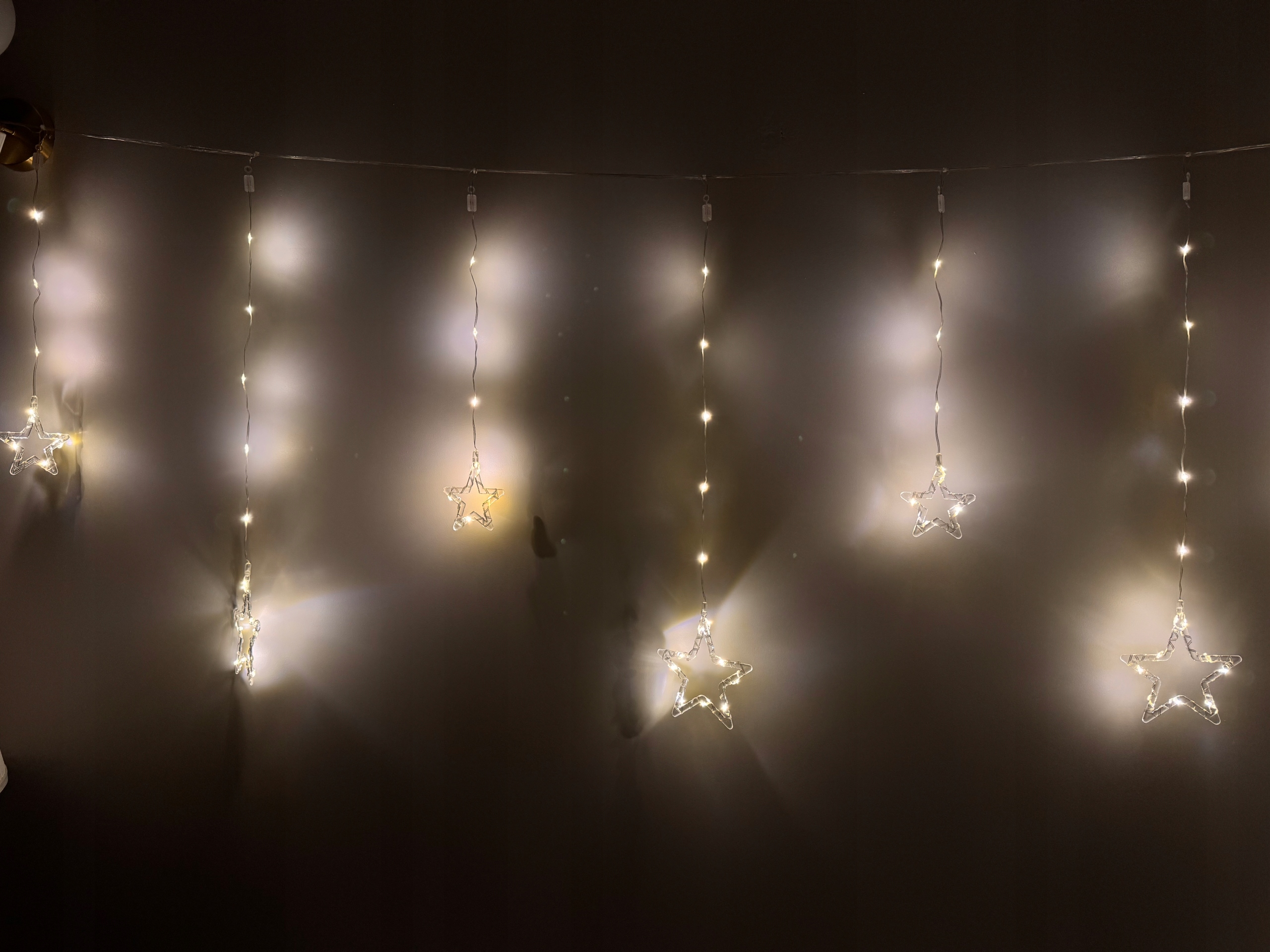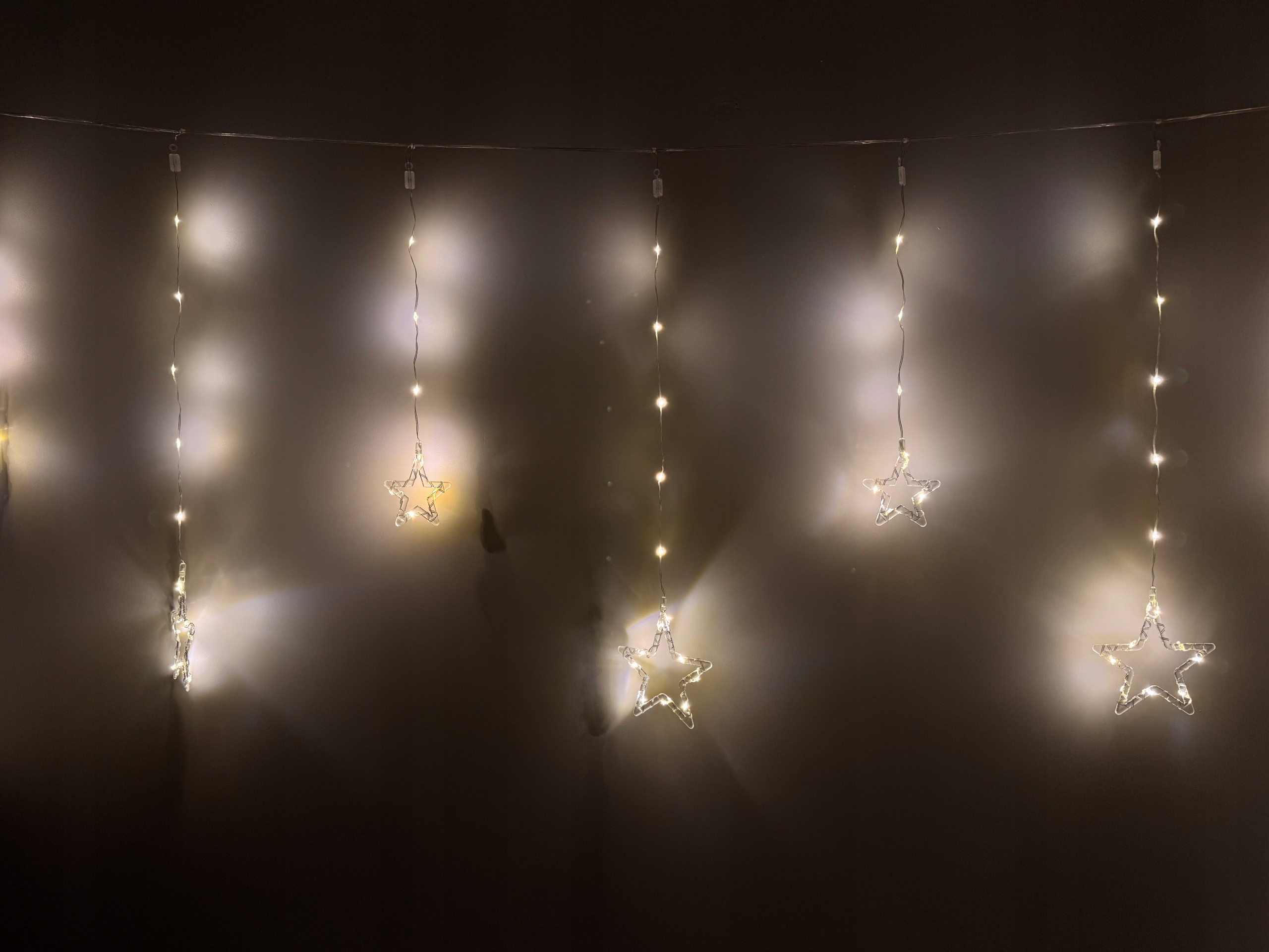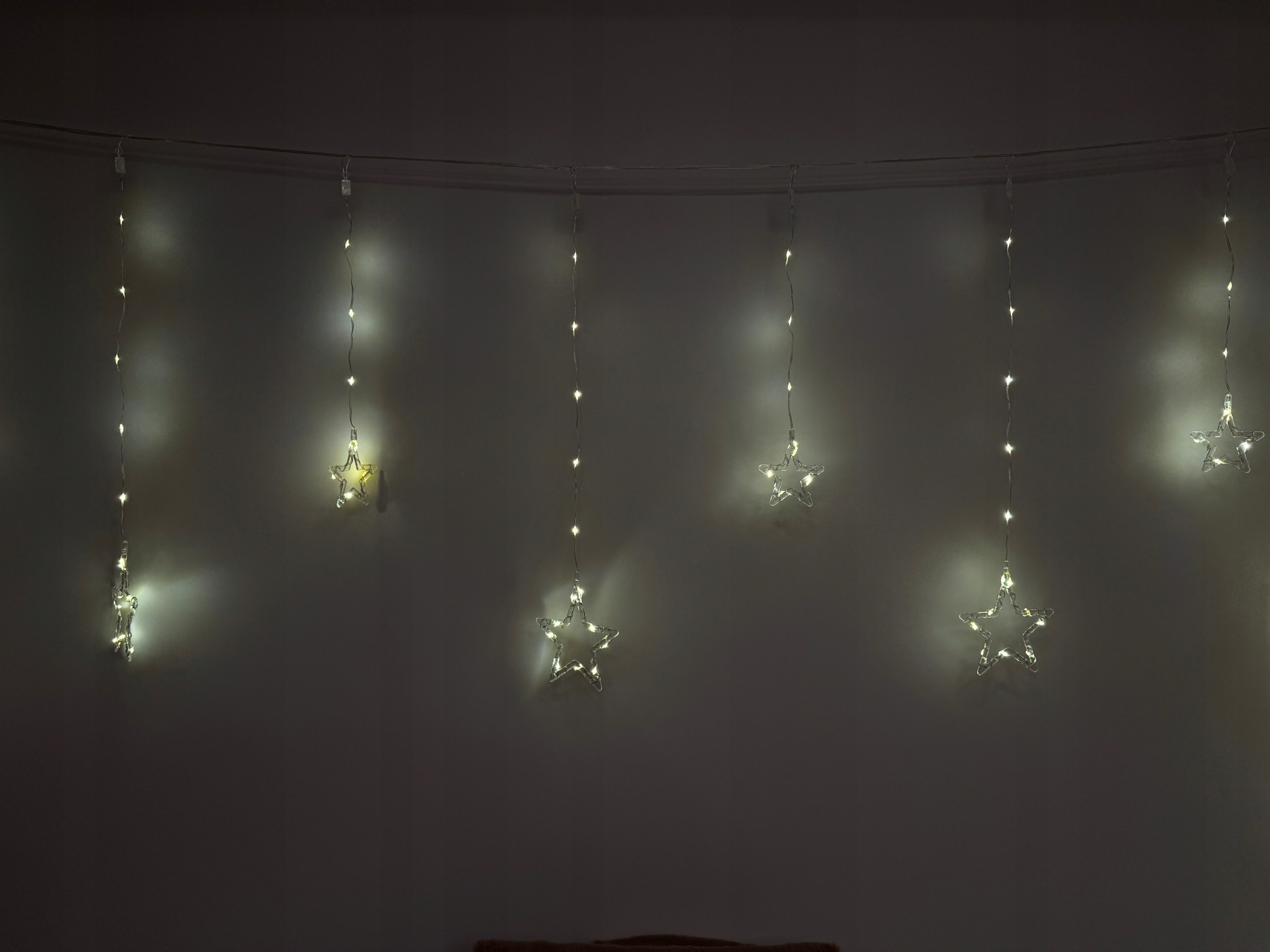 Kurtyna LED posiada dekoracyjne zawieszki w kształcie gwiazdek. Dzięki temu instalacja tworzy klasyczny motyw świąteczny. Jednocześnie różne rozmiary gwiazdek nadają dekoracji efekt warstwowy.