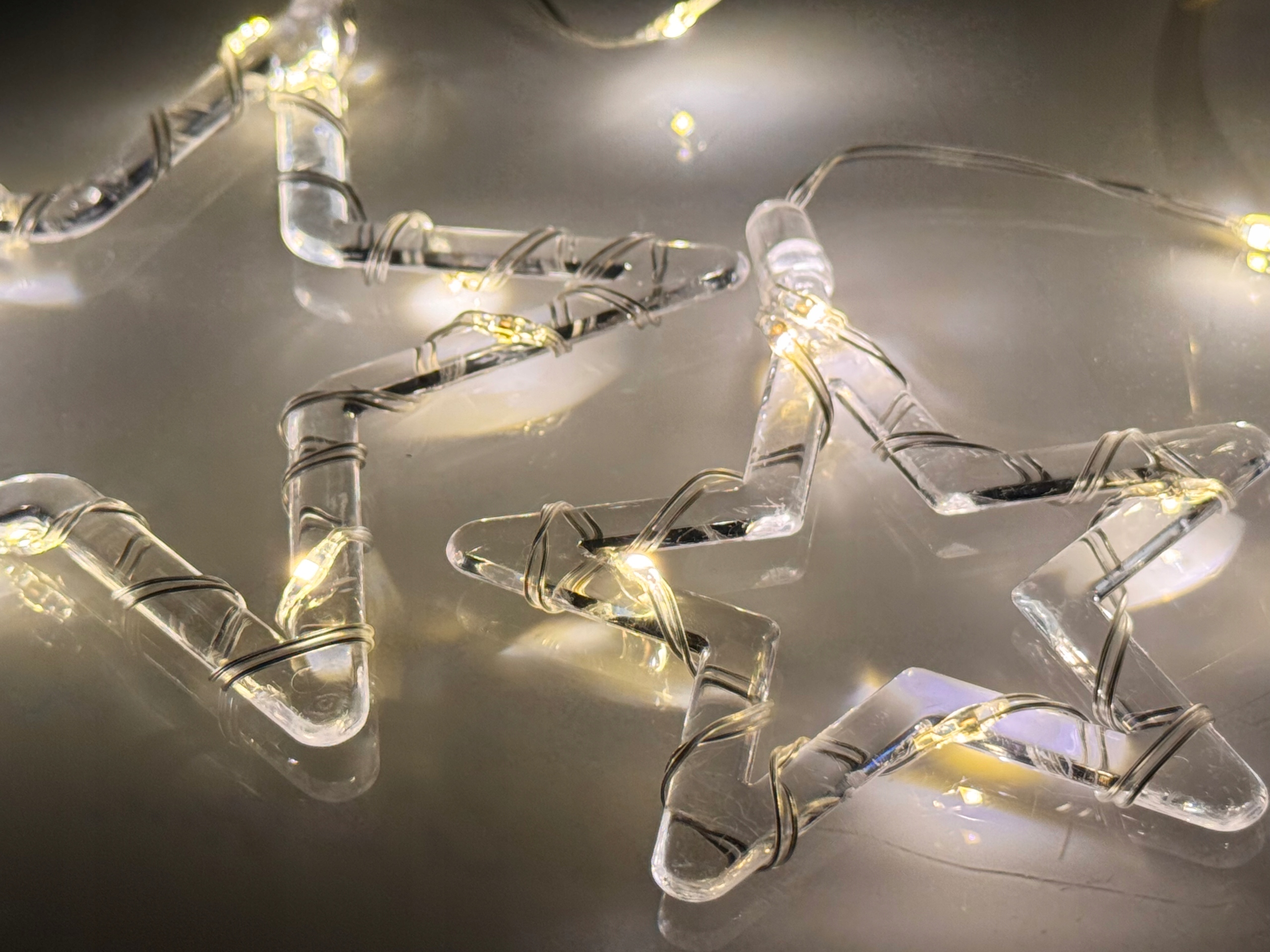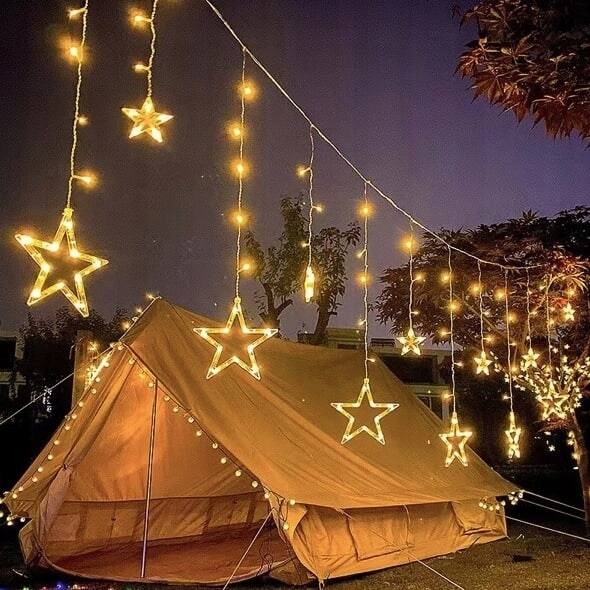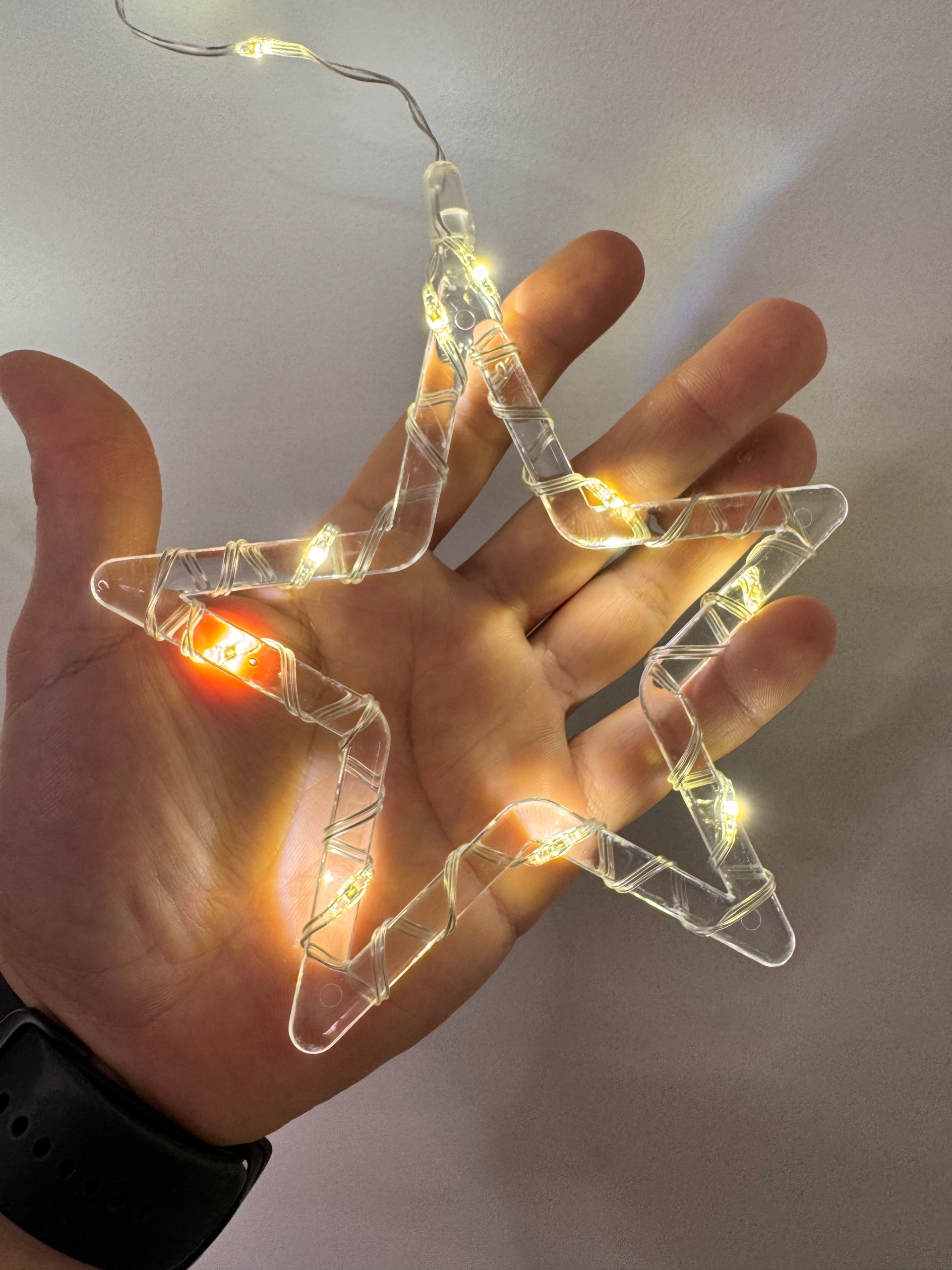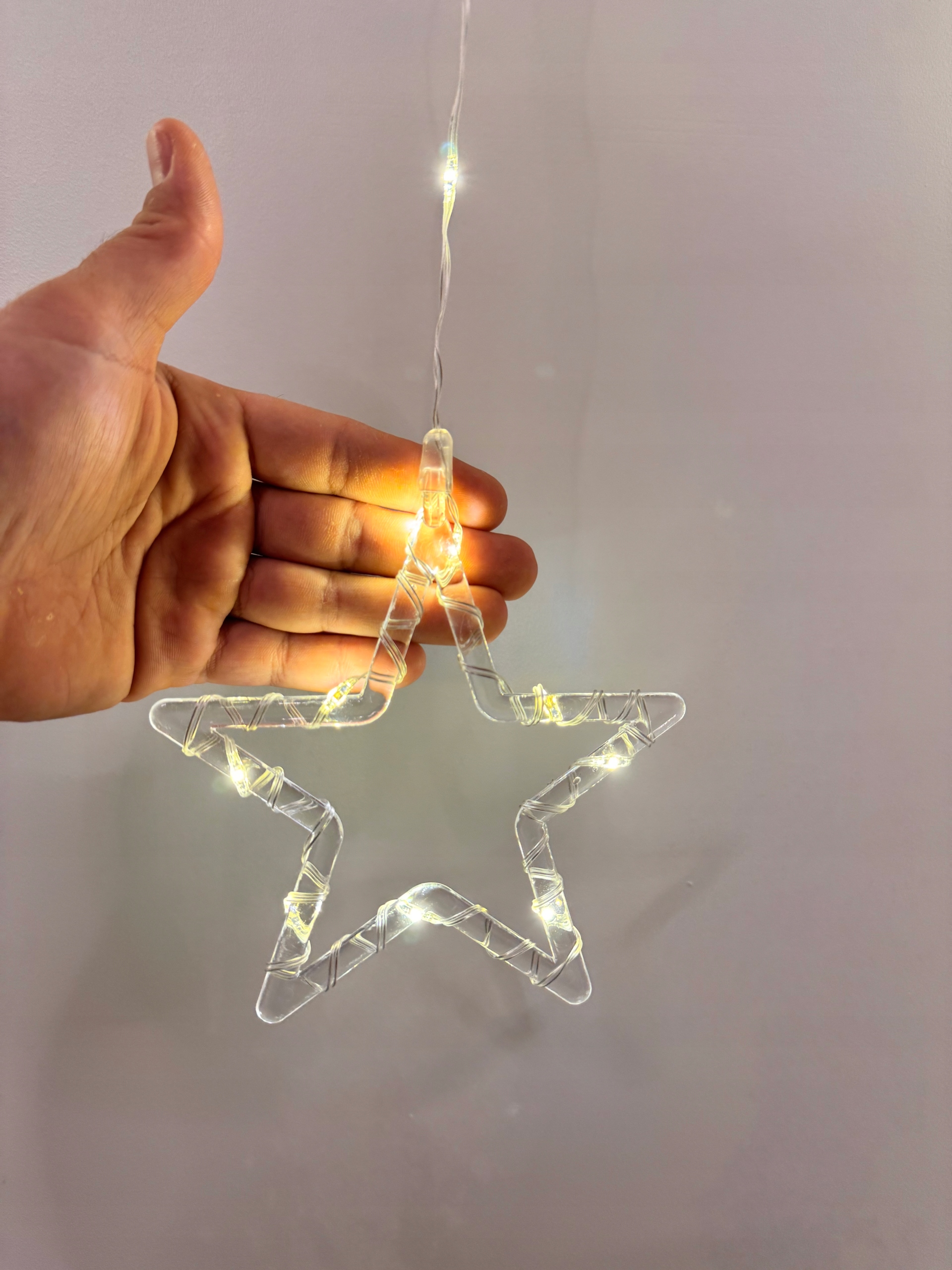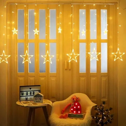 Kurtyna LED posiada dekoracyjne zawieszki w kształcie gwiazdek. Dzięki temu instalacja tworzy klasyczny motyw świąteczny. Jednocześnie różne rozmiary gwiazdek nadają dekoracji efekt warstwowy.