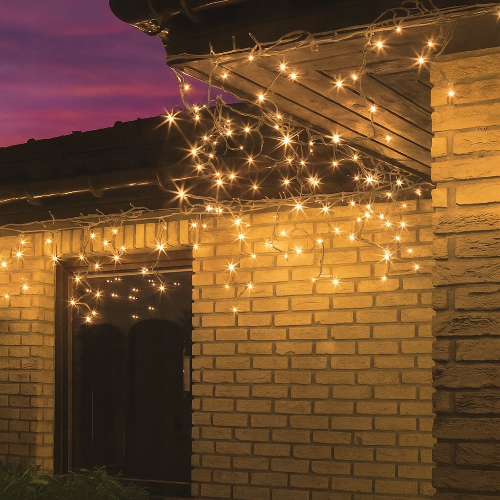 Kurtyna LED sople 440 LED ciepła biel flash to efektowna dekoracja świąteczna przeznaczona do dużych iluminacji. Zestaw posiada aż 440 diod LED świecących ciepłym białym światłem oraz dodatkowe zimne diody flash. Dzięki temu dekoracja tworzy efekt migoczących gwiazd oraz skrzącego się śniegu.
