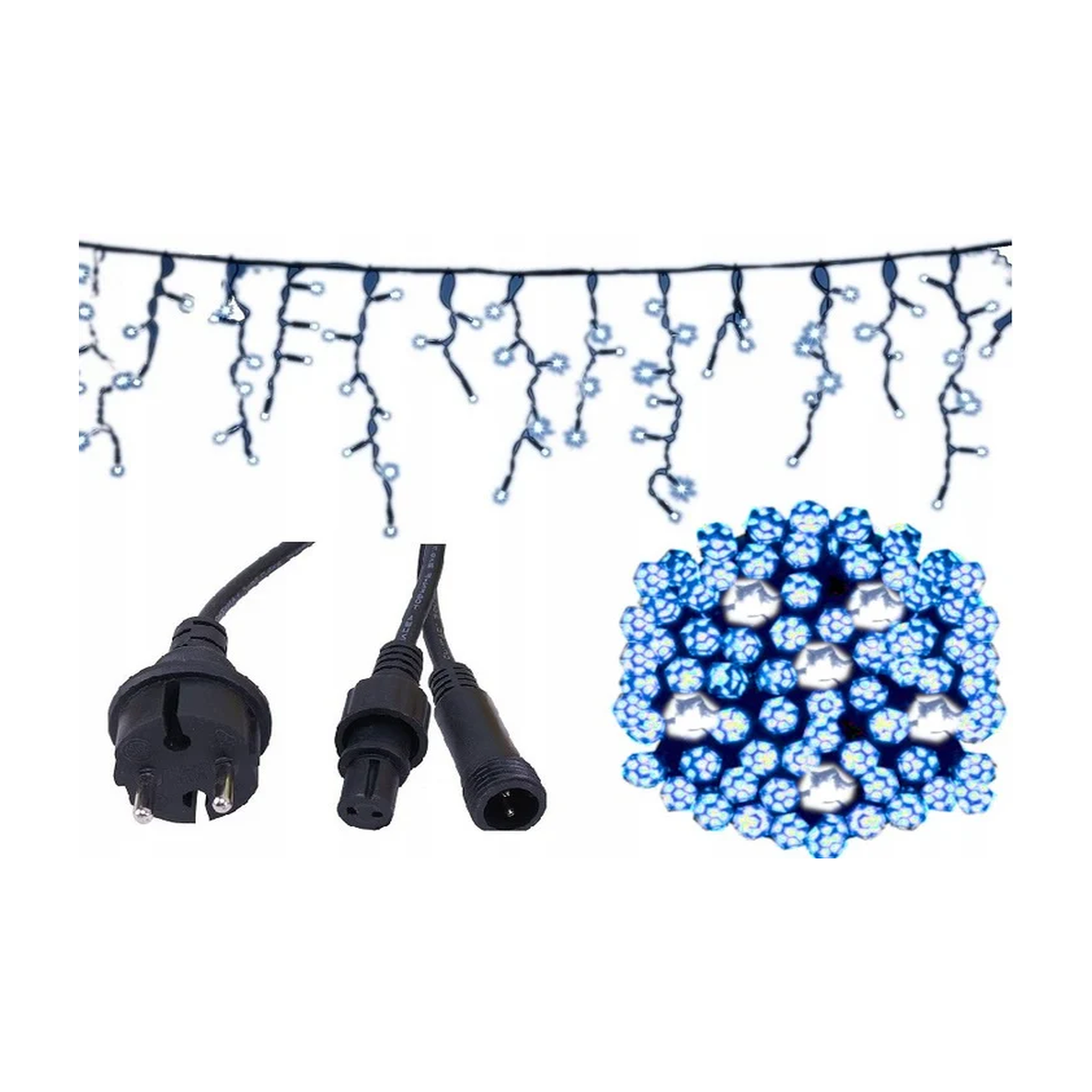 Kurtyna LED sople 440 LED niebieskie flash to efektowna dekoracja świąteczna przeznaczona do dużych iluminacji. Lampki świecą intensywnym niebieskim światłem, natomiast dodatkowe diody zimne flash tworzą dynamiczne błyski. Dzięki temu powstaje efekt migoczących gwiazd oraz skrzącego się śniegu.