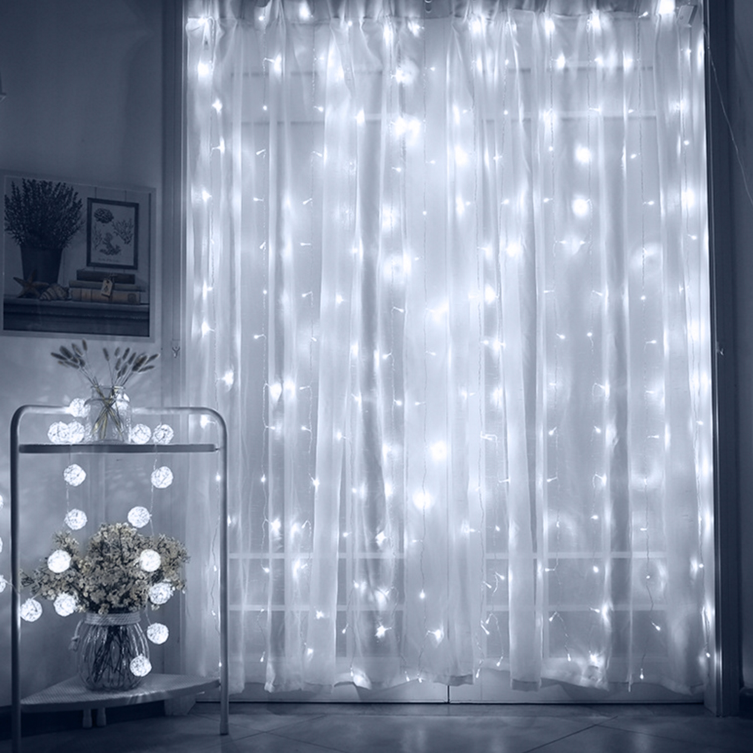 Kurtyna LED 3×2 m z 200 diodami w zimnej białej barwie to elegancka dekoracja świetlna do domu i na eventy. Zestaw posiada 10 pionowych przewodów z mikro diodami LED na srebrnym druciku. Dzięki temu kurtyna tworzy gęstą i nowoczesną iluminację świetlną.