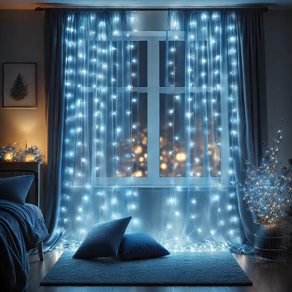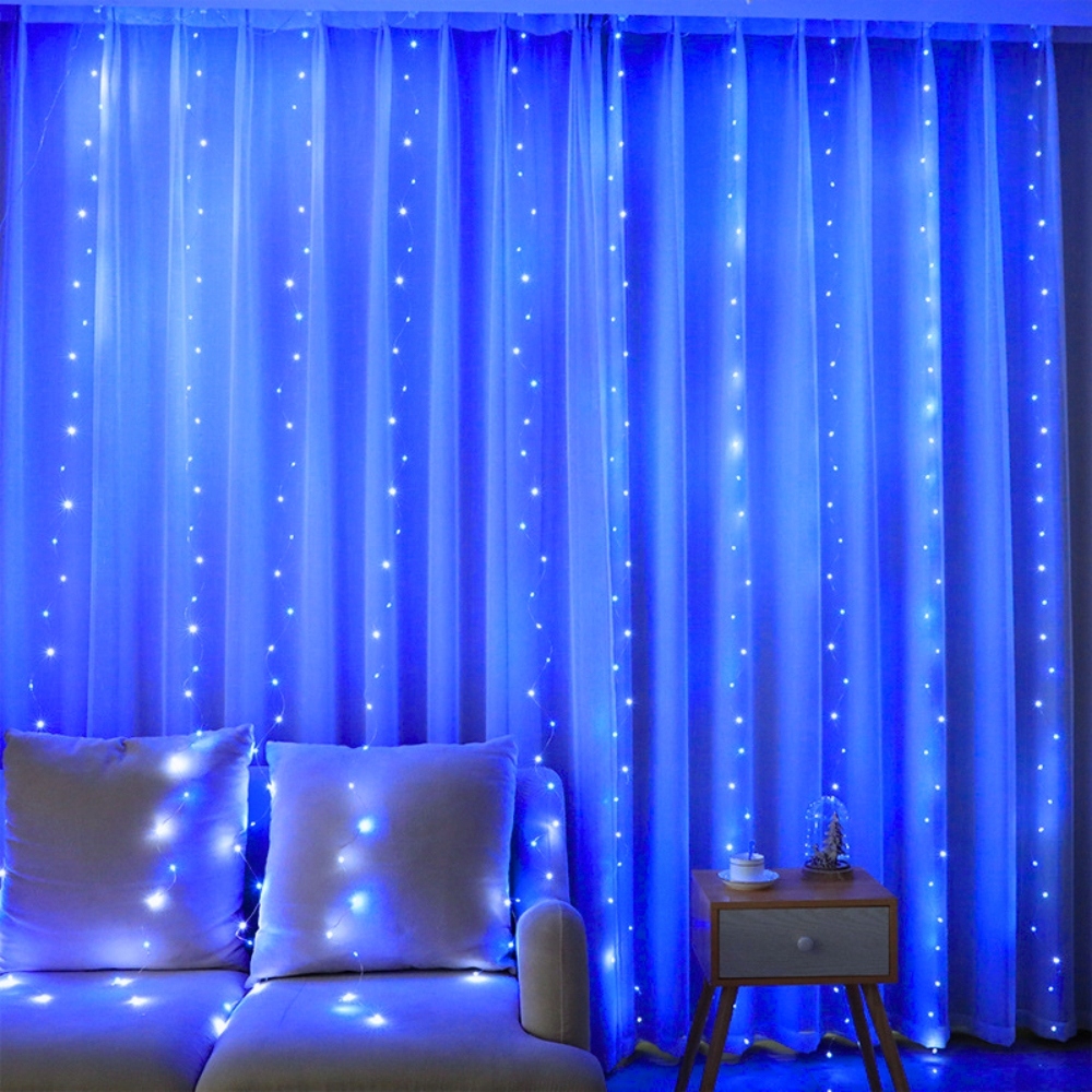 Kurtyna LED 3×3 m z 300 diodami w niebieskiej barwie światła to nowoczesna dekoracja do domu, eventów oraz aranżacji świątecznych. Zestaw posiada 10 pionowych przewodów z mikro diodami LED umieszczonymi na srebrnym druciku. Dzięki temu tworzy efektowną świetlną ścianę.
