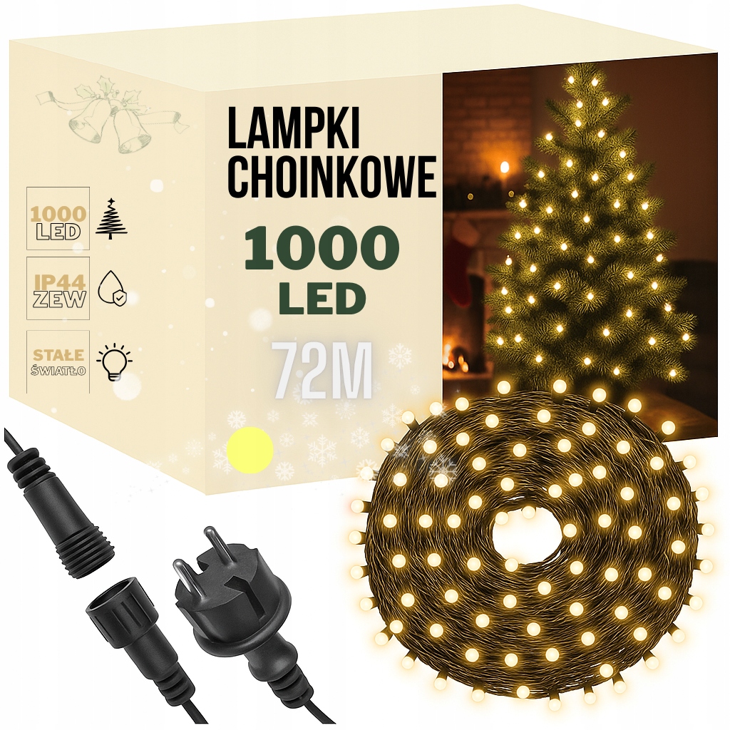 Lampki choinkowe 1000 LED o długości 72 metrów to sprawdzone oświetlenie świąteczne do dekoracji domu oraz ogrodu. Jednolita barwa biała ciepła tworzy przytulną i elegancką poświatę, dlatego idealnie podkreśla choinkę, elewację lub ogrodzenie. Ponieważ zestaw świeci światłem stałym, bez migotania i efektów dynamicznych, uzyskujesz spokojny oraz równomierny efekt na całej długości przewodu. To rozwiązanie szczególnie polecane tam, gdzie liczy się estetyka i klasyczny wygląd dekoracji.