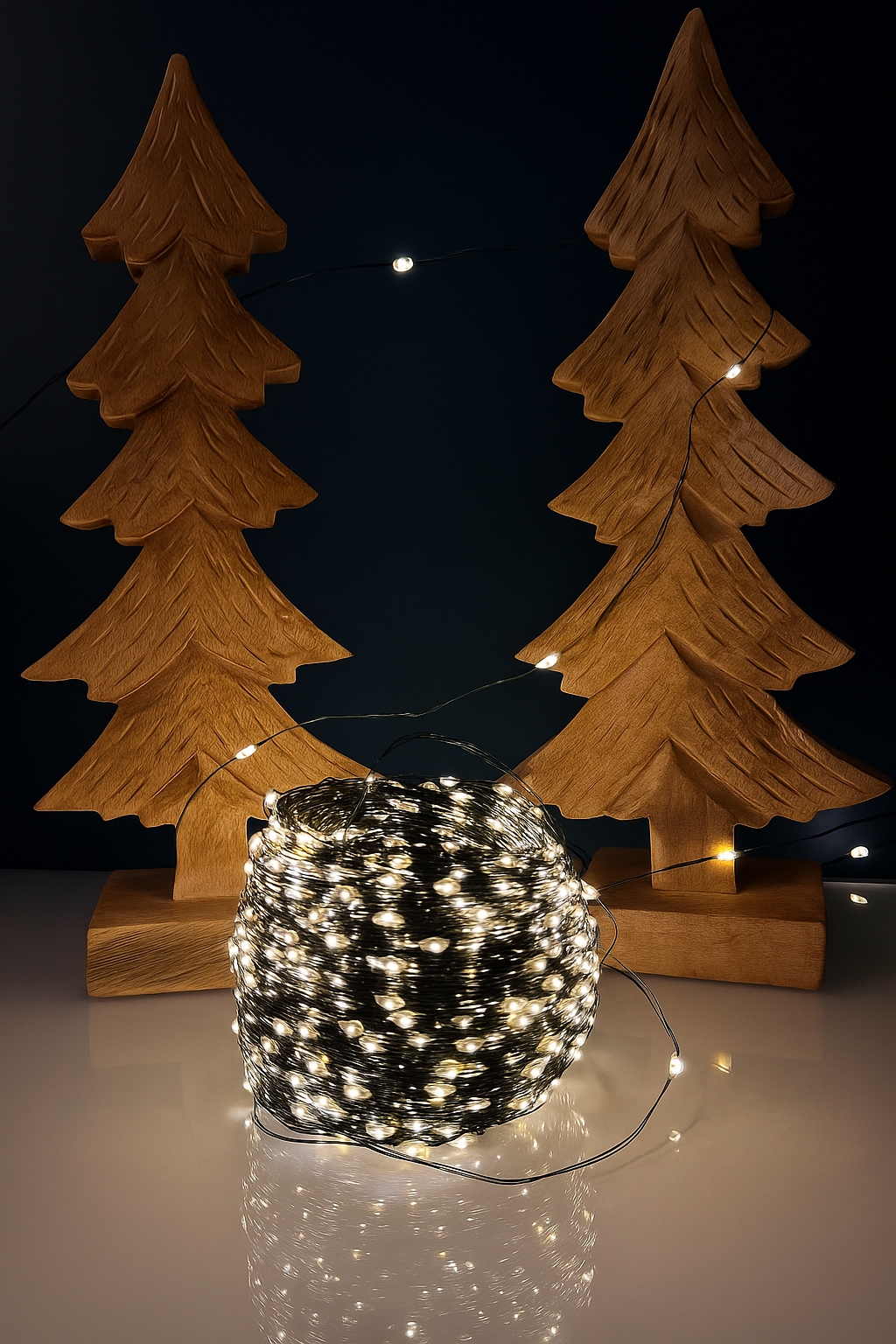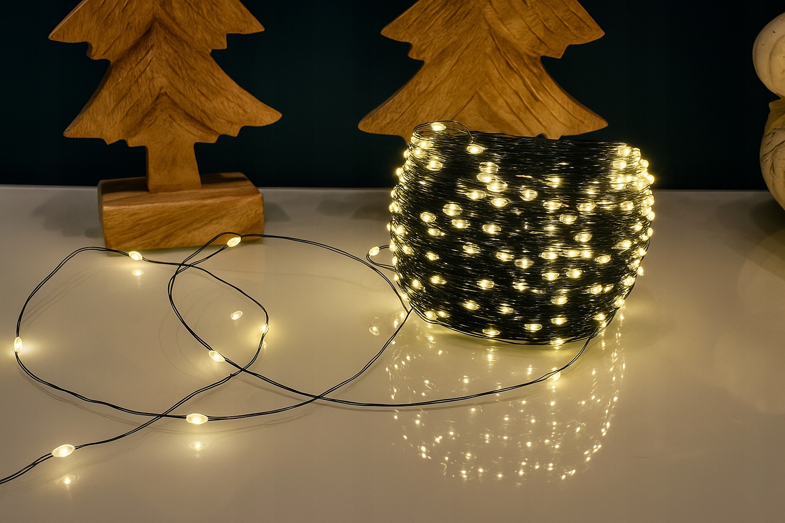 Lampki choinkowe 500 LED na zielonym mikro druciku to subtelna dekoracja świąteczna. Dlatego sprawdzą się w domu i ogrodzie. Długość 50 metrów pozwala równomiernie oświetlić choinkę lub większą przestrzeń.