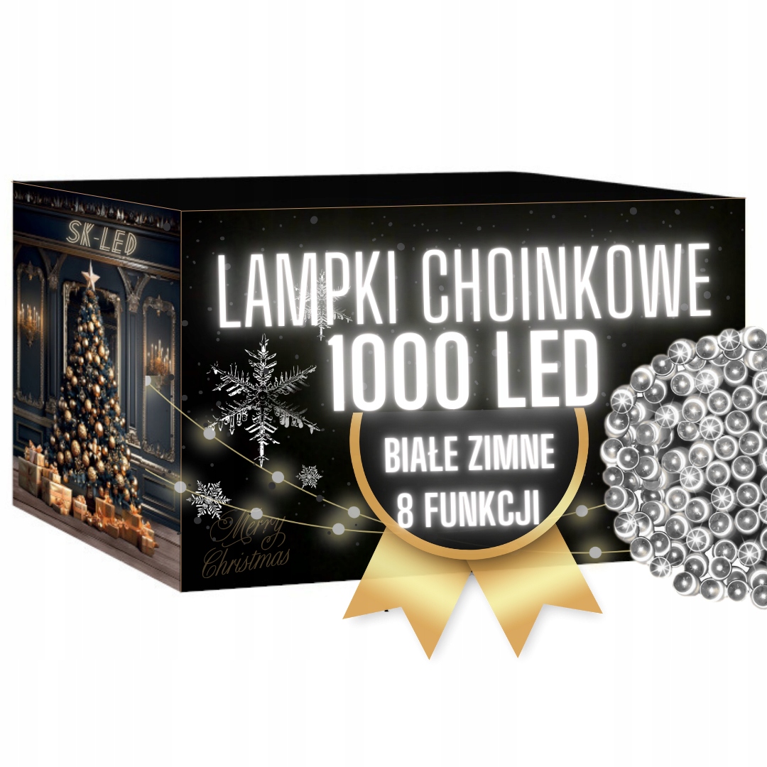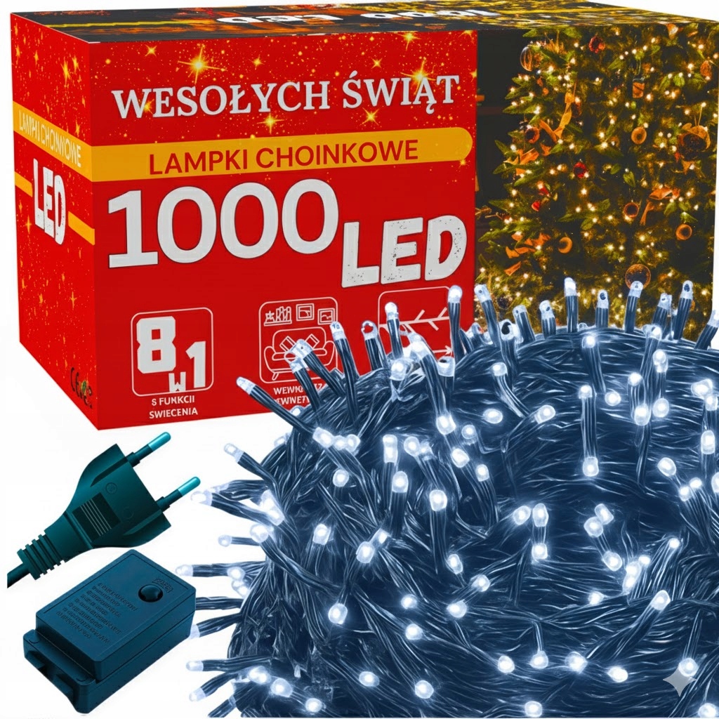 Lampki choinkowe LED 1000 w barwie białej zimnej to idealne rozwiązanie do dużych dekoracji świątecznych. Emitują jasne, chłodne światło, dlatego tworzą nowoczesny i wyrazisty efekt. Długość 72 metrów pozwala ozdobić duże choinki, elewacje oraz ogrodzenia, a jednocześnie zachować równomierne rozmieszczenie światła.