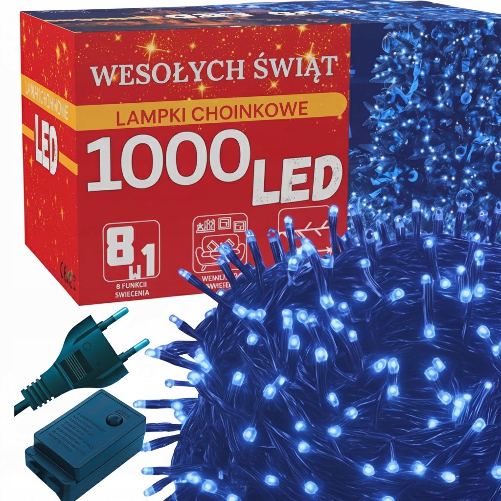 Lampki choinkowe LED 1000 w kolorze niebieskim to efektowna dekoracja świąteczna do dużych przestrzeni. Emitują chłodne, intensywne światło, dlatego tworzą nowoczesny i wyrazisty klimat. Długość 72 metrów pozwala ozdobić duże choinki, elewacje oraz ogrodzenia, a jednocześnie zachować równomierny efekt na całej powierzchni.
