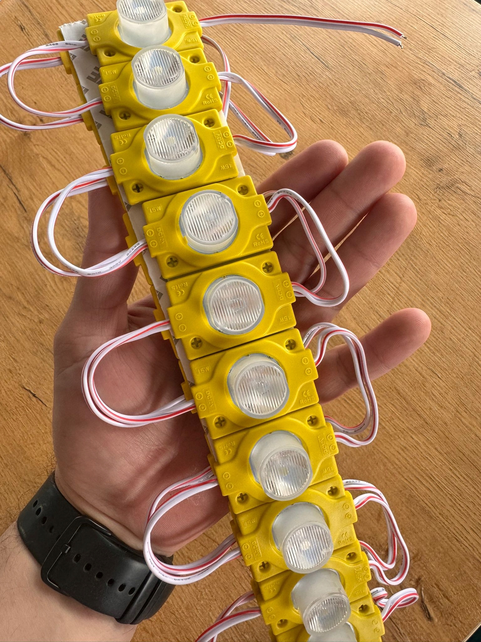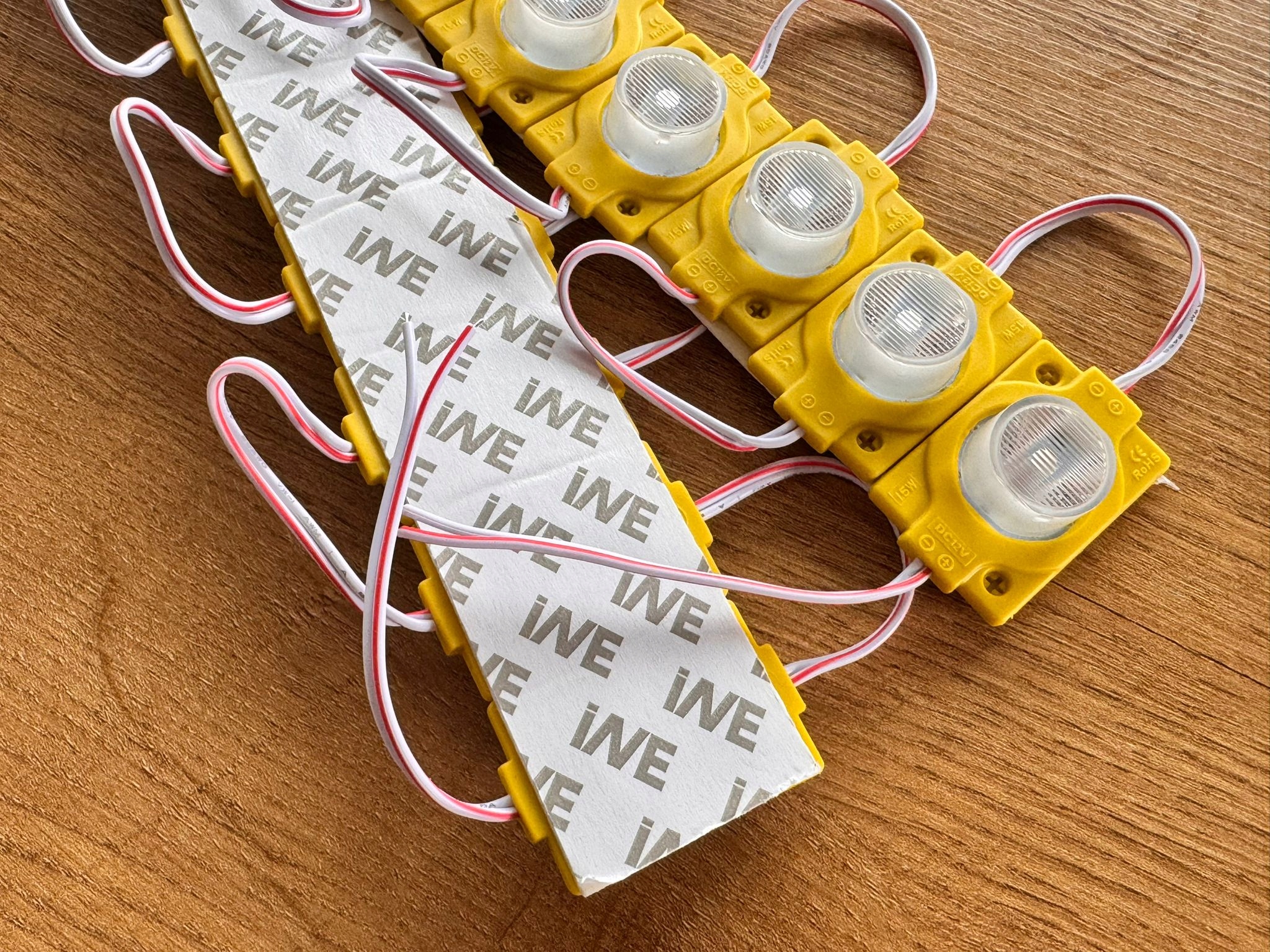 Moduły można łączyć przez lutowanie, dlatego łatwo zbudujesz dłuższe ciągi świetlne. Dzięki temu rozwiązanie sprawdza się w kasetonach reklamowych, literach LED oraz dekoracjach świetlnych.