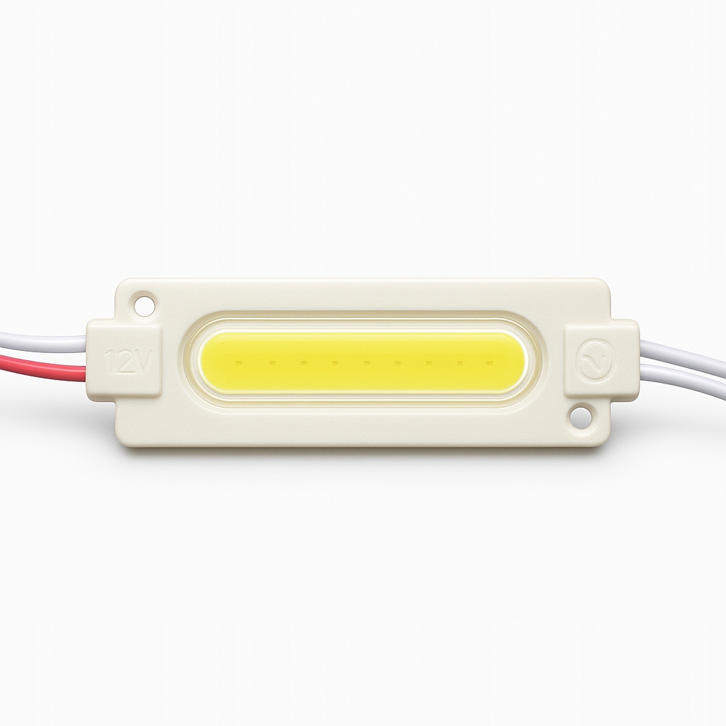 Moduł LED COB 12V 3W IP65 biały ciepły 3000K to wydajne i energooszczędne źródło światła do instalacji dekoracyjnych oraz reklamowych. Technologia COB (Chip on Board) tworzy jednolitą linię światła. Dzięki temu moduł świeci równomiernie i nie powoduje efektu pojedynczych punktów.