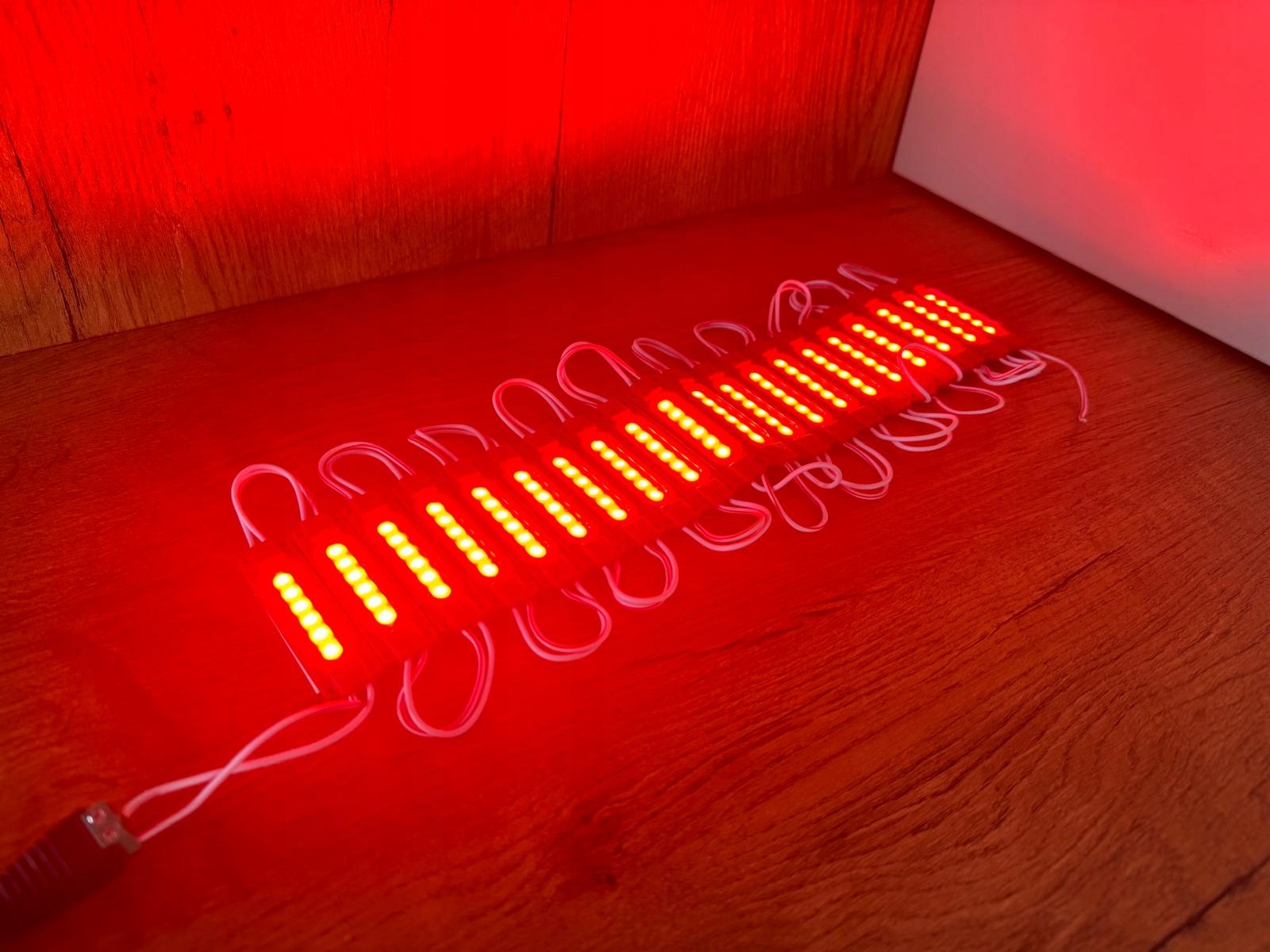 Moduły można łączyć przez lutowanie przewodów, dlatego łatwo stworzysz dłuższe linie świetlne. Dzięki temu rozwiązanie sprawdza się w kasetonach reklamowych, dekoracjach wnętrz oraz projektach DIY.