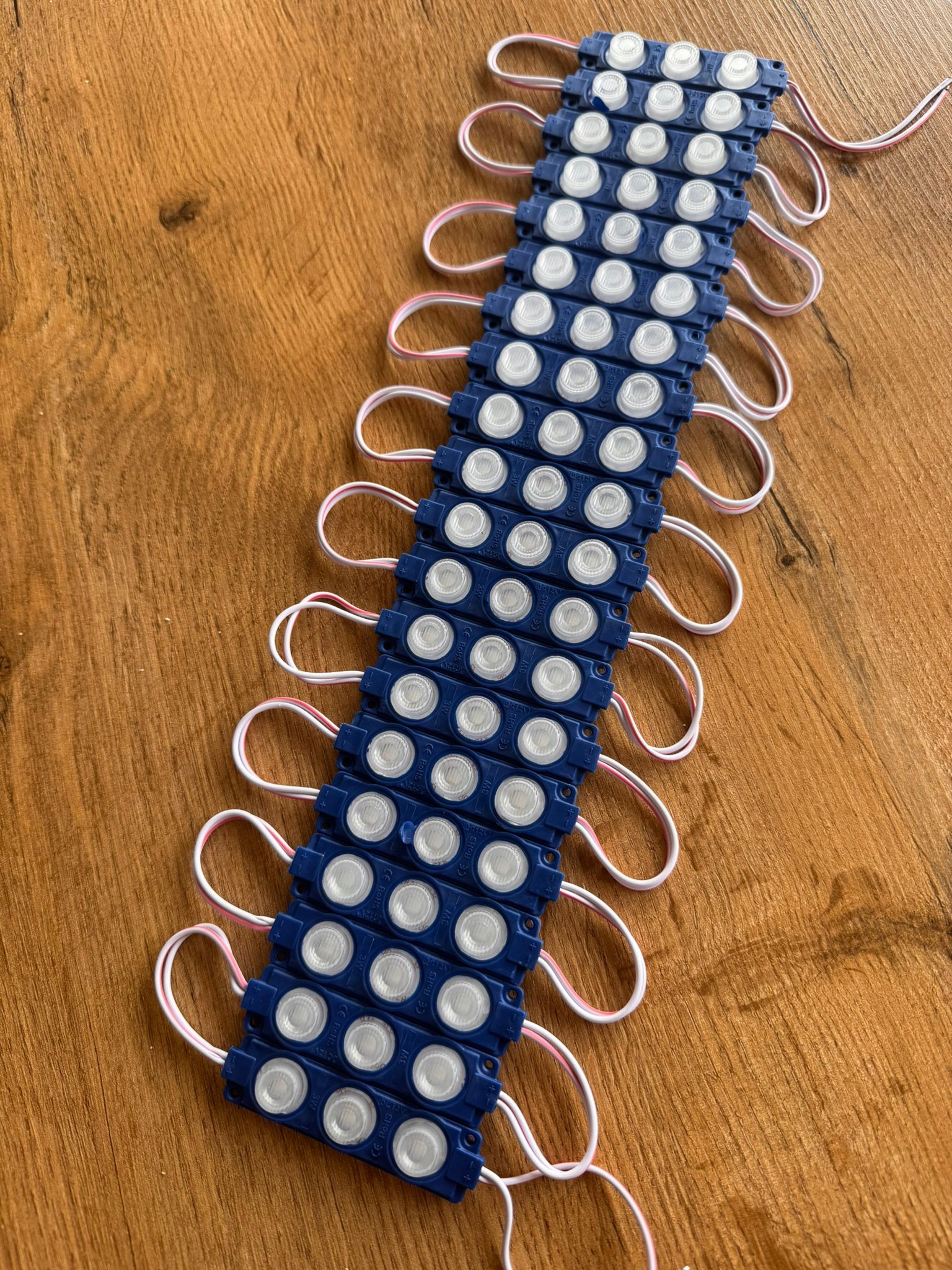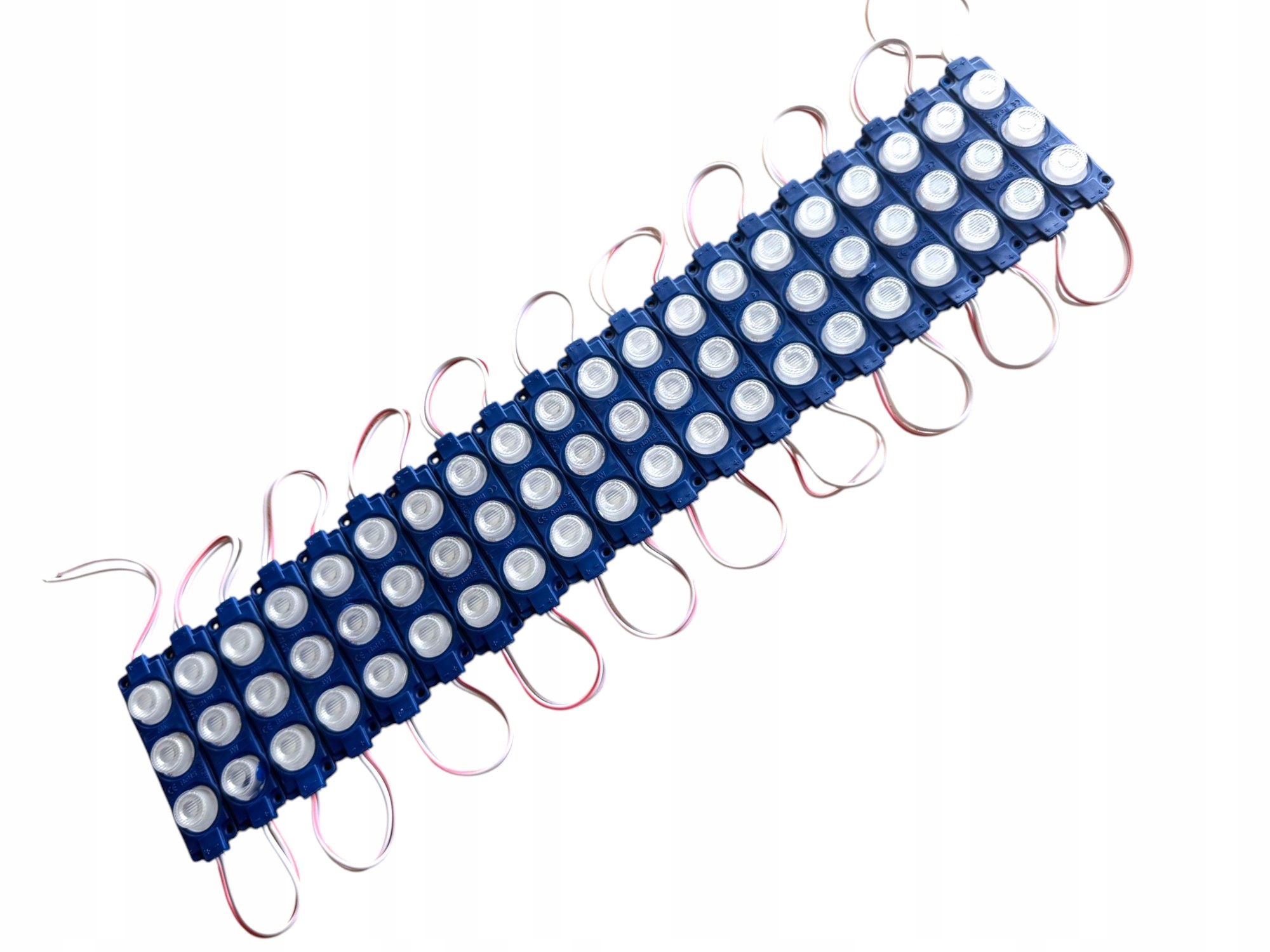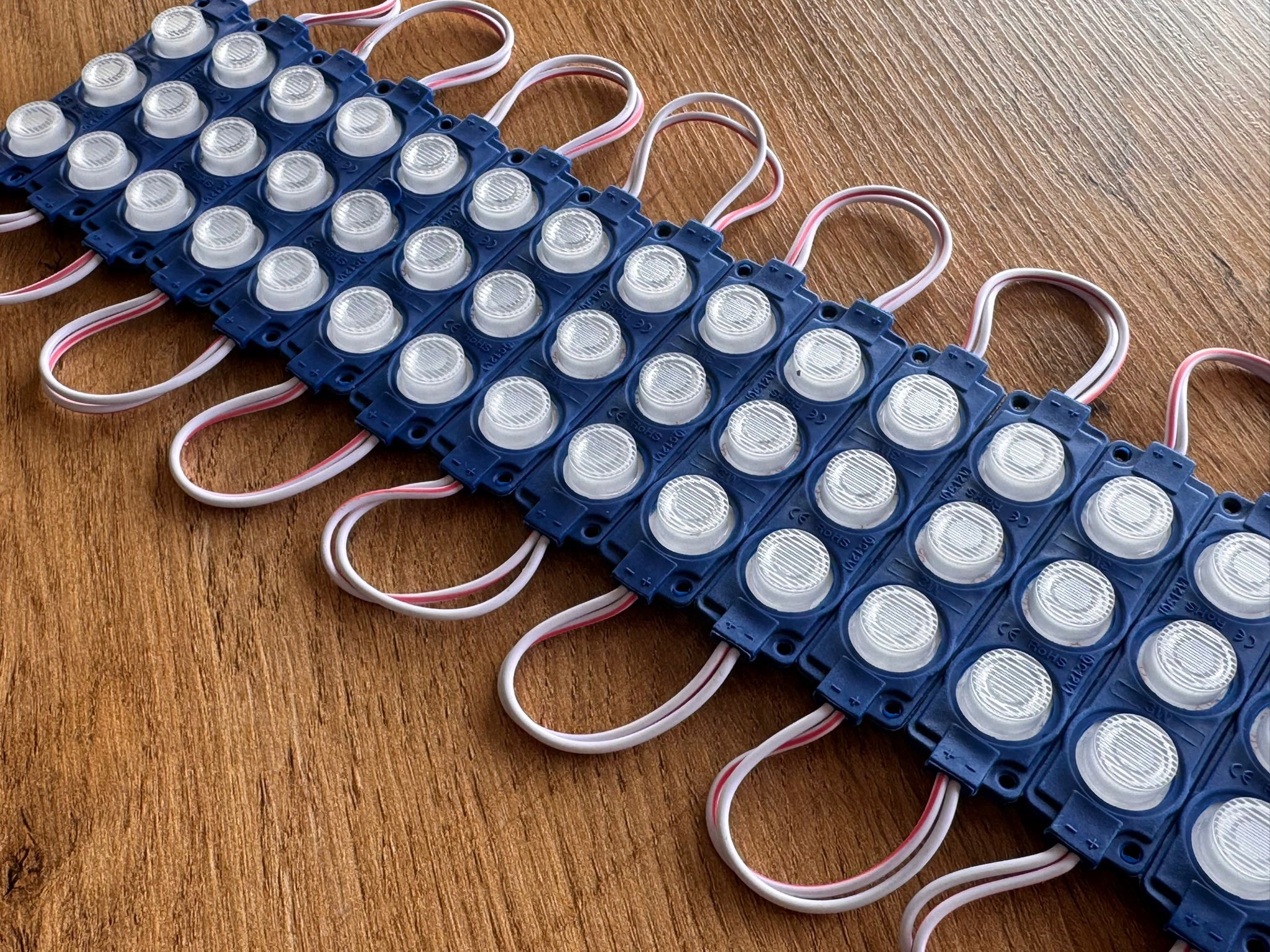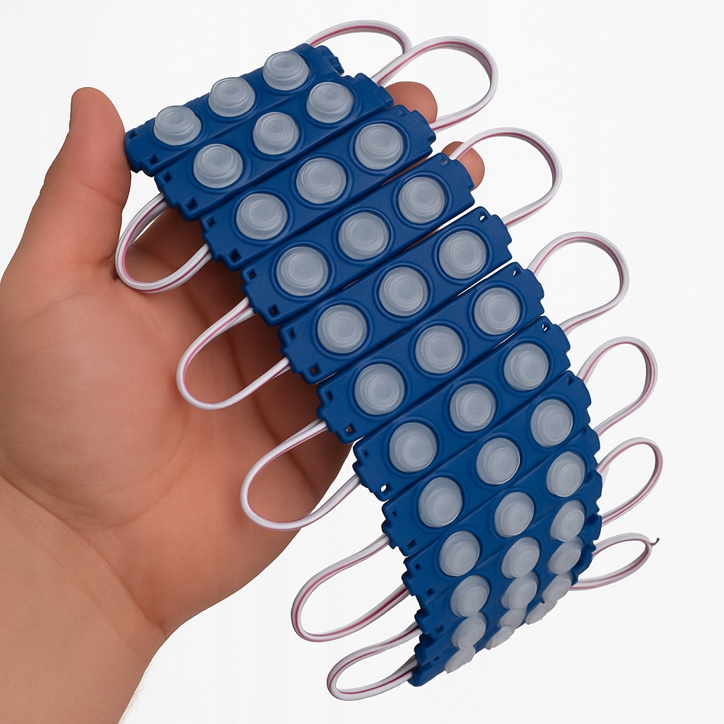Moduły można łączyć przez lutowanie przewodów, dlatego łatwo zbudujesz dłuższe linie świetlne. Dzięki temu rozwiązanie sprawdza się w kasetonach reklamowych, literach LED oraz projektach DIY.