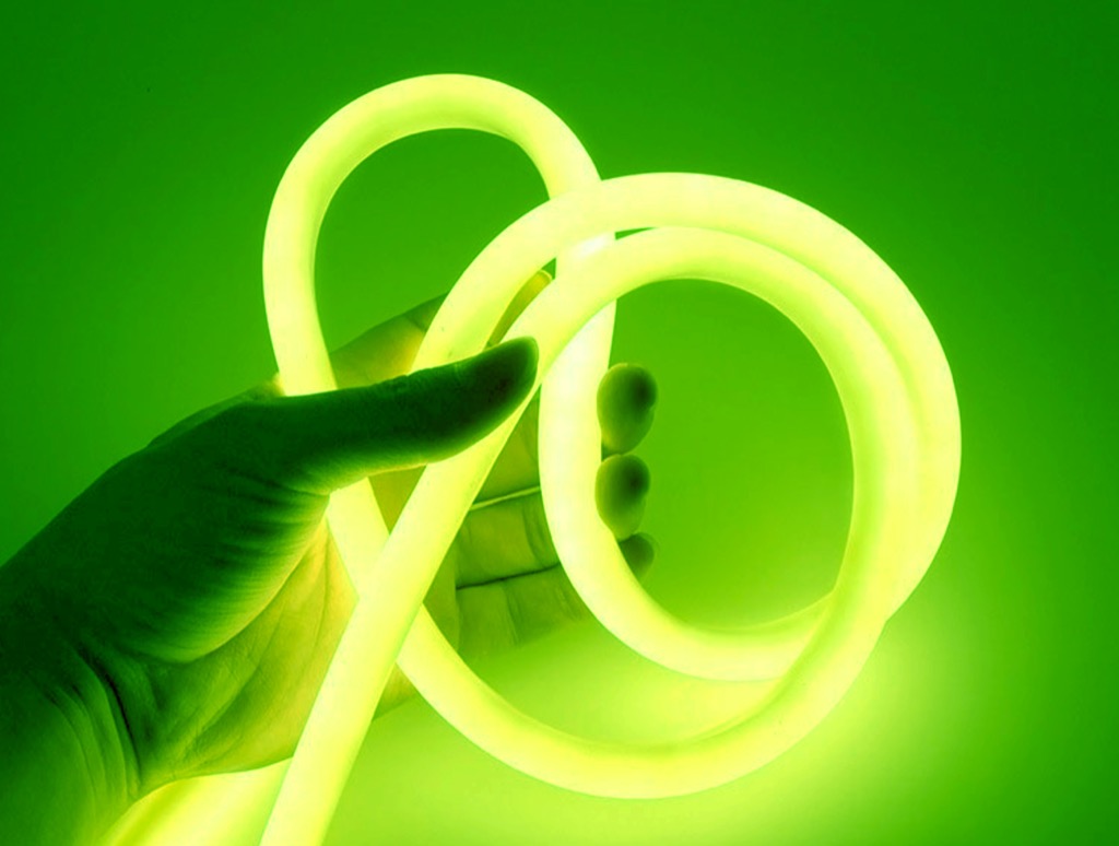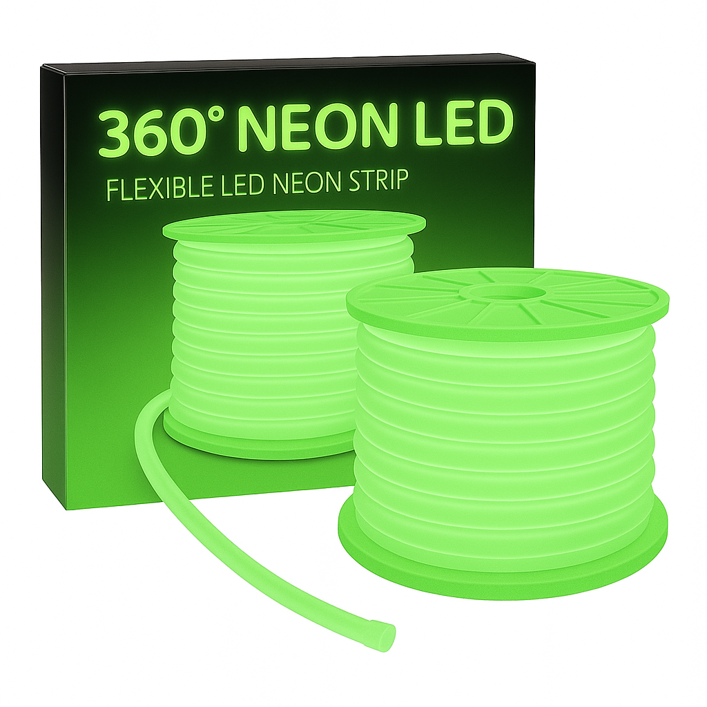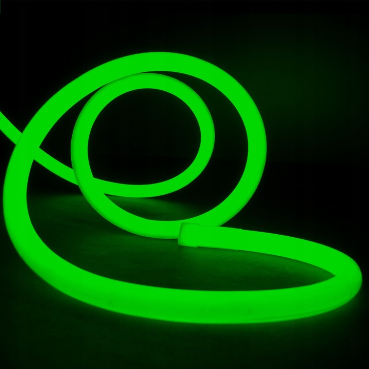 NEON FLEX LED 230V 360° zielony 8W/mb IP68 to elastyczne i w pełni dookólne oświetlenie dekoracyjne. Świeci w zakresie 360°, dlatego daje równomierny efekt z każdej strony. Dzięki temu idealnie nadaje się do obrysów, napisów oraz iluminacji przestrzennych.
