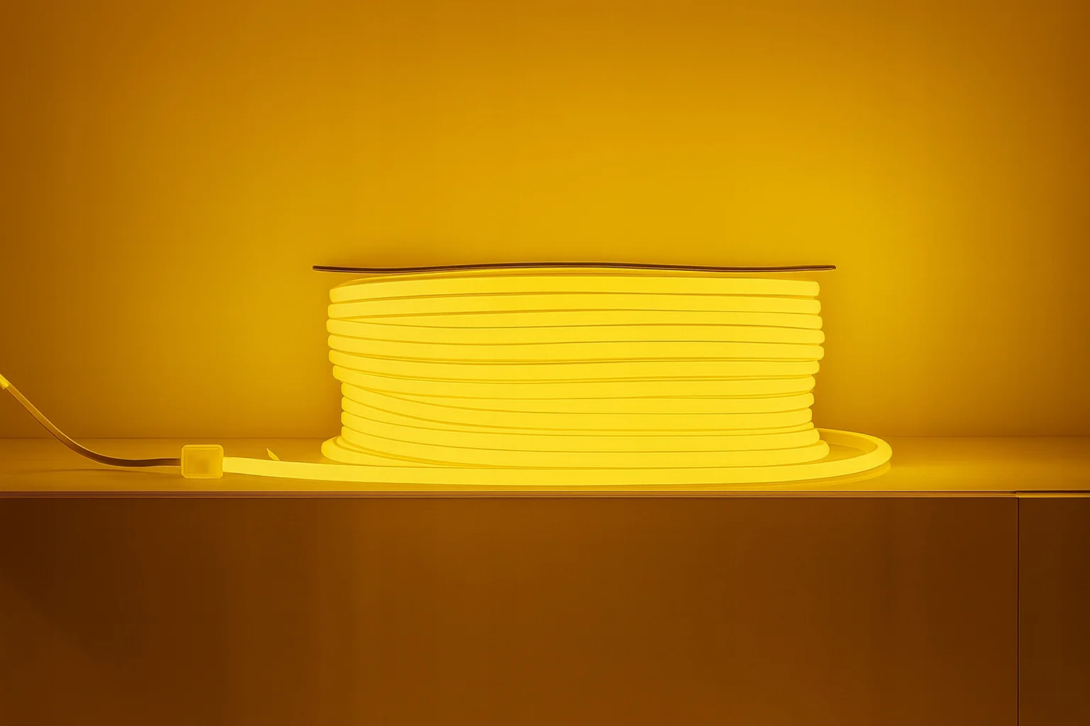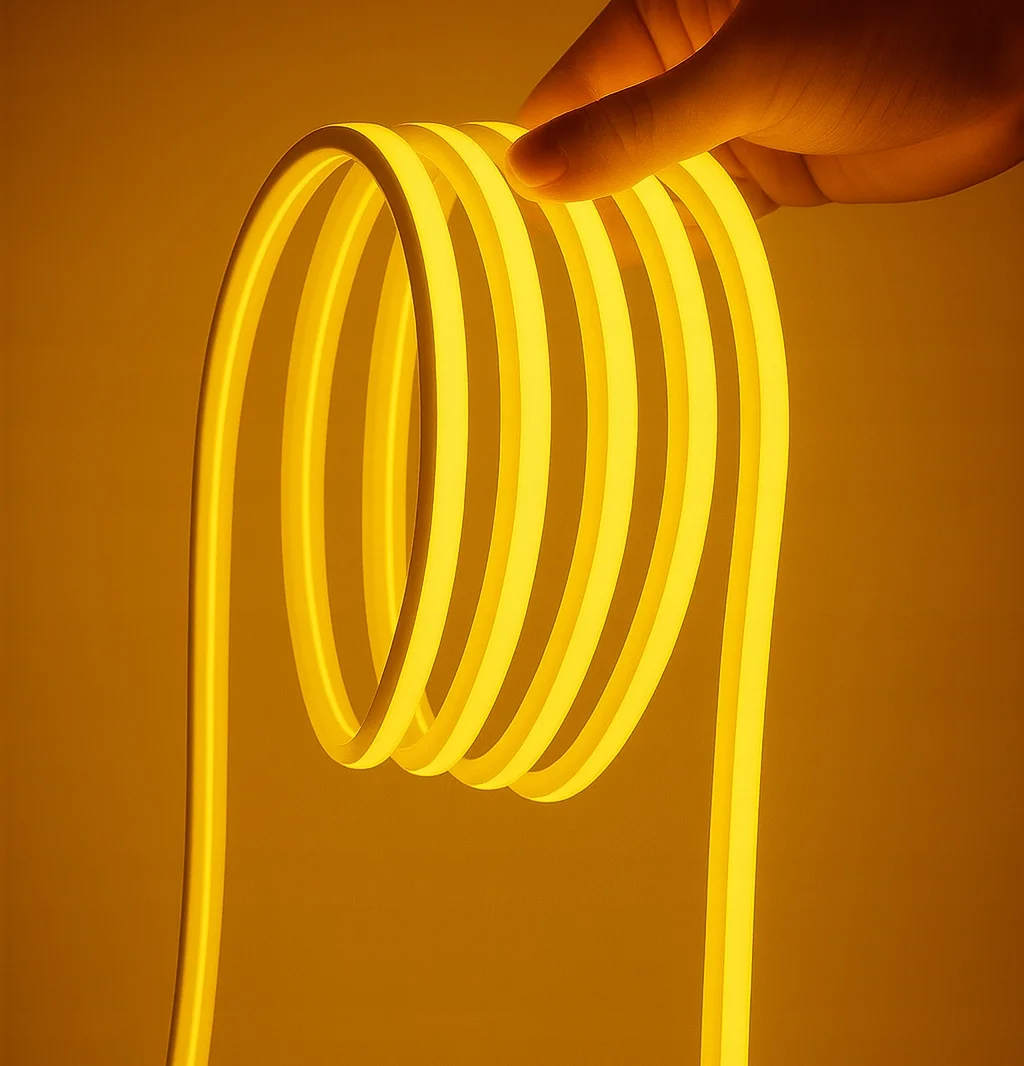 Taśma NEON LED 230V SMD 240 LED/m 10mm IP65 żółta to nowoczesne oświetlenie dekoracyjne o jednolitej linii światła. Diody są ukryte w mlecznej osłonie, dlatego nie widać punktów LED. Dzięki temu efekt pozostaje gładki i elegancki.
