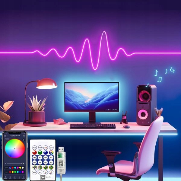 Neon oferuje sterowanie Bluetooth, dlatego kontrolujesz światło z aplikacji mobilnej. Ponadto tryb muzyczny synchronizuje efekty z dźwiękiem, więc tworzy wyjątkowy klimat. Zasilanie 5V zwiększa bezpieczeństwo, dlatego sprawdzi się w domu. Jednocześnie zestaw zawiera uchwyty i pilot, więc montaż i obsługa są wygodne.