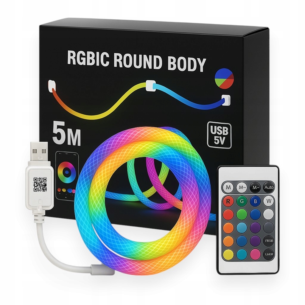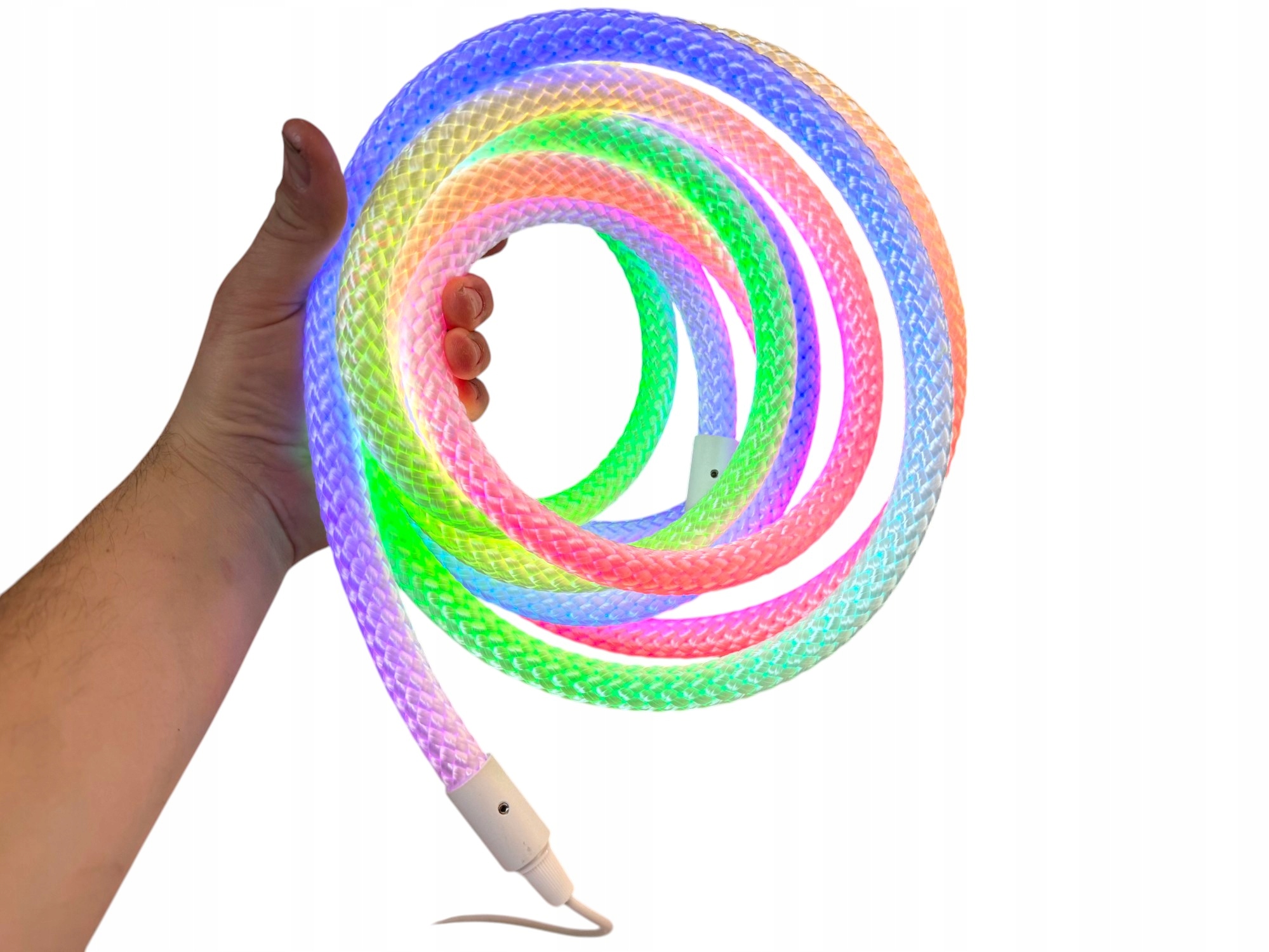 Sznur LED RGB 360° Digital 5 m to nowoczesne oświetlenie dekoracyjne o pełnym kącie świecenia. Emituje światło dookoła, dlatego tworzy wyjątkowy efekt wizualny. Dzięki technologii RGB DIGITAL uzyskasz dynamiczne animacje i płynne przejścia kolorów. To rozwiązanie idealne do wnętrz oraz przestrzeni zewnętrznych.