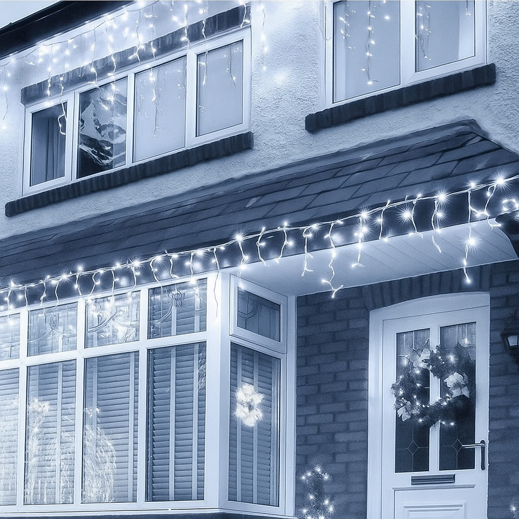 Kurtyna świetlna sople 200 LED o długości 8,8 m to nowoczesna dekoracja zewnętrzna. Dlatego świetnie sprawdzi się na elewacji, balkonie lub pod okapem dachu. Zimna biel światła nadaje aranżacji wyrazisty i elegancki charakter.