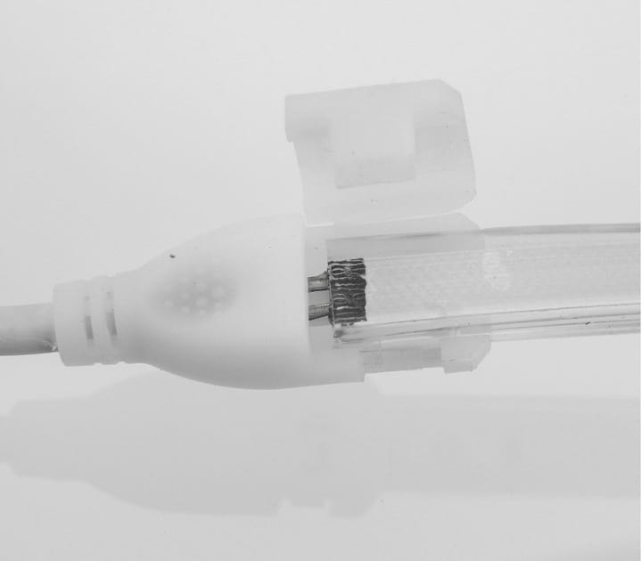 Stabilizator nie wykorzystuje klasycznych konektorów. Dlatego nie musisz trafiać w zatopione przewody w taśmie. Wystarczy wsunąć wtyk w taśmę LED COB, a następnie zacisnąć klamrę. W efekcie montaż jest prostszy, szybszy i bezpieczniejszy.