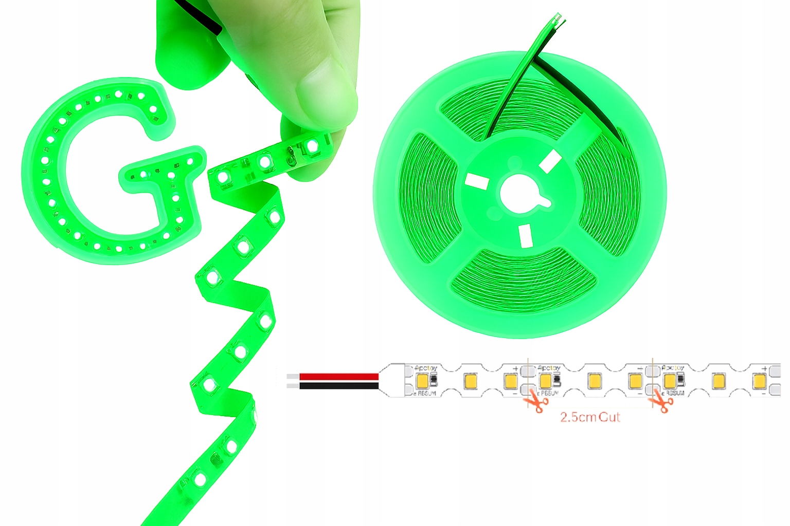 Taśma wykorzystuje diody SMD 2835 w ilości 120 LED na metr. Dzięki temu generuje intensywne zielone światło, które dobrze podkreśla elementy dekoracyjne oraz reklamy.