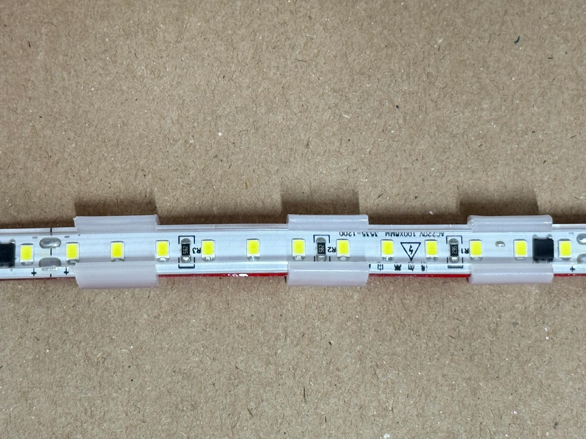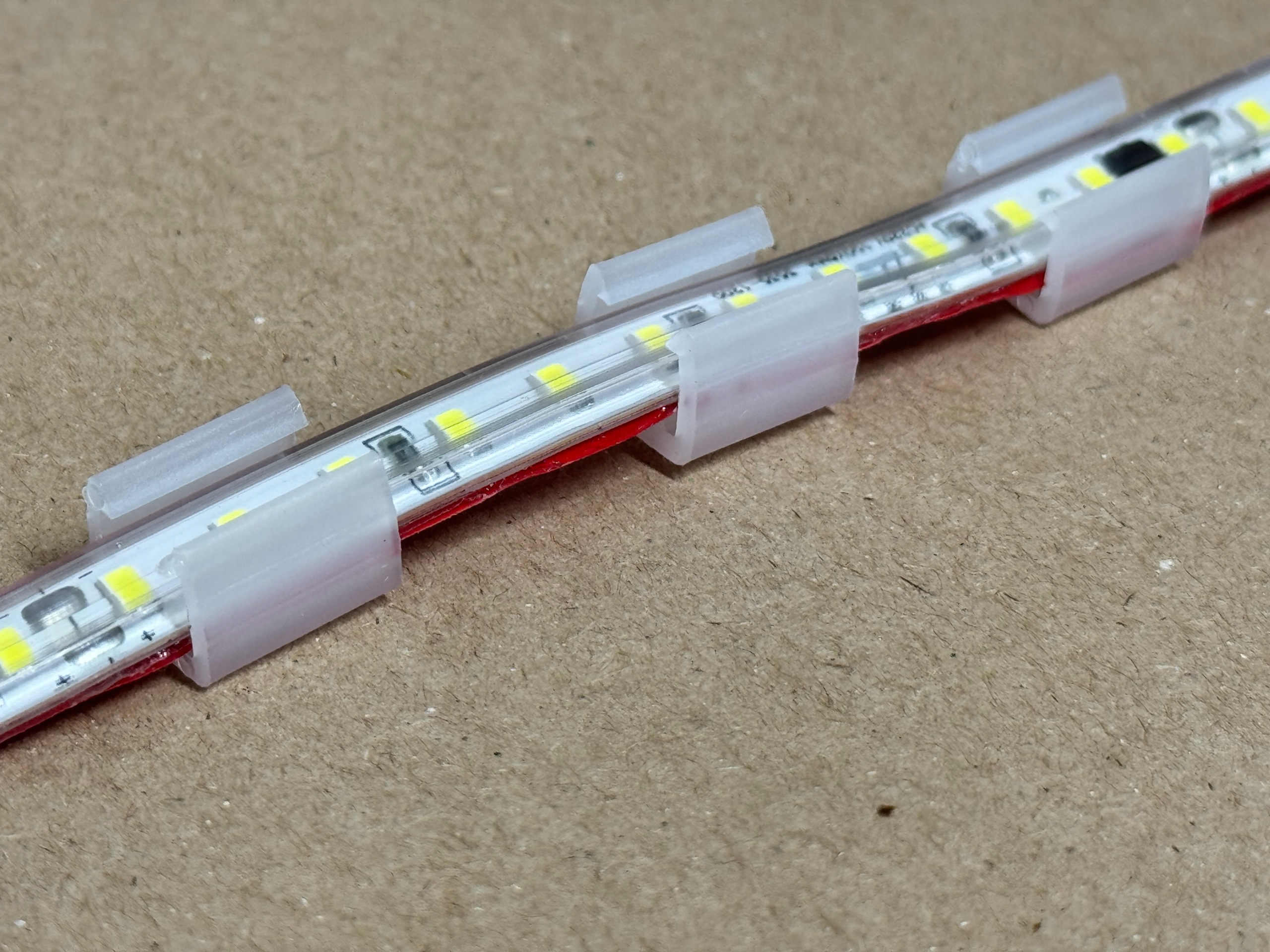 Klips montażowy utrzymuje taśmę LED w odpowiedniej pozycji. Dlatego oświetlenie zachowuje równą linię światła. Ponadto montaż jest bardzo prosty, więc instalację wykonasz w kilka sekund.