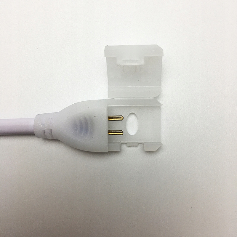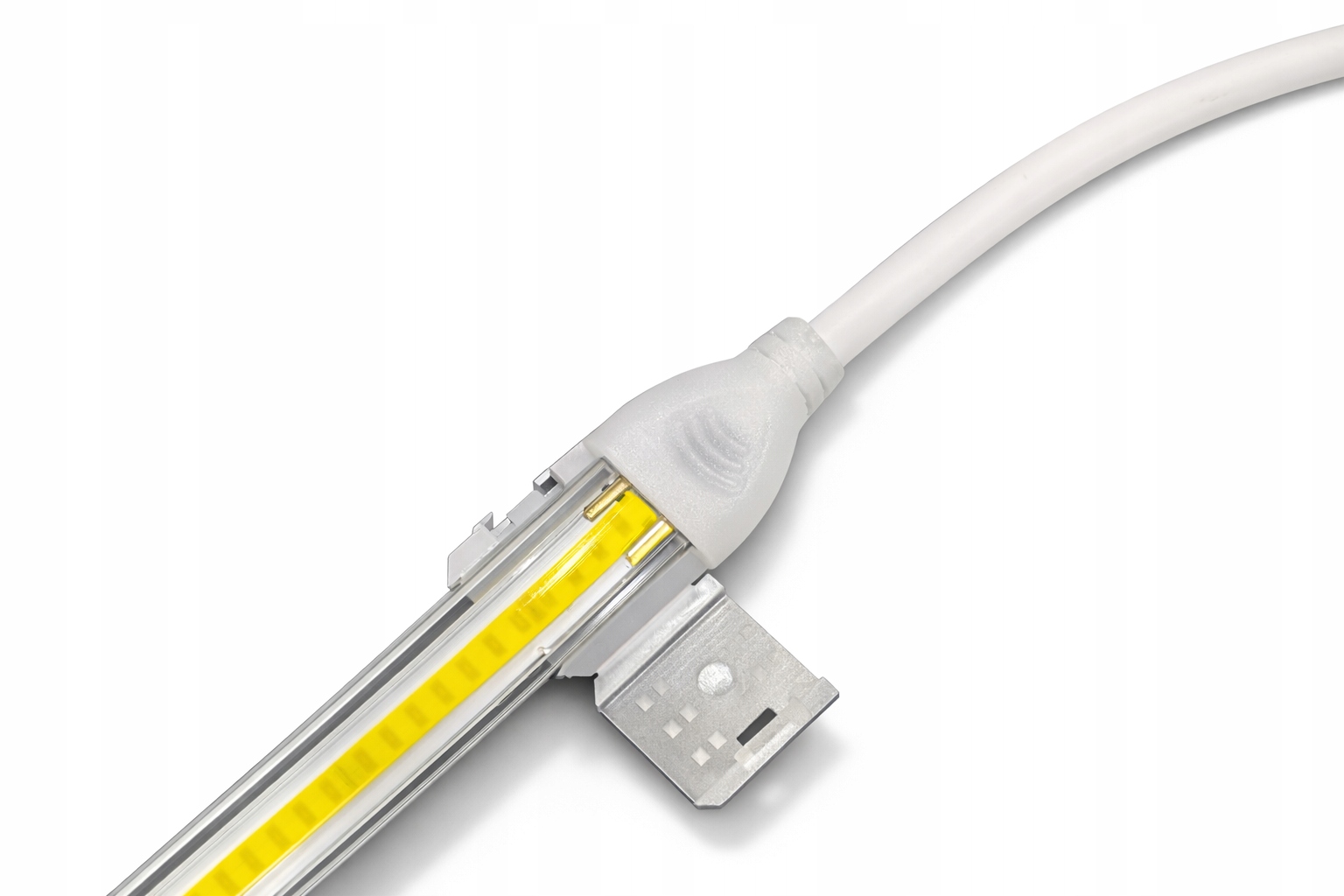 Złączka pozwala łatwo połączyć odcinki taśm COB LED 230V. Dzięki temu instalacja świetlna pozostaje ciągła oraz stabilna. Metalowe piny zapewniają pewny kontakt z przewodami taśmy LED. Dlatego połączenie działa bez migotania lub przerw w zasilaniu.
